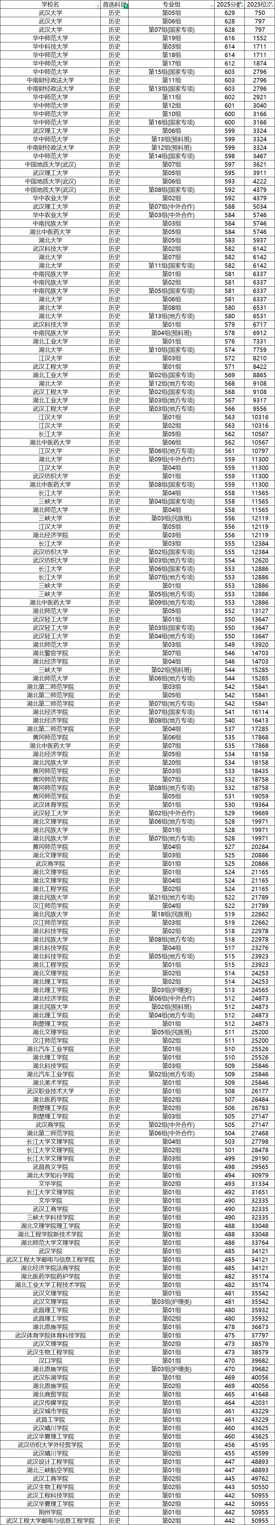 二、2025年全国本科院校在湖北历史类录取分数线
