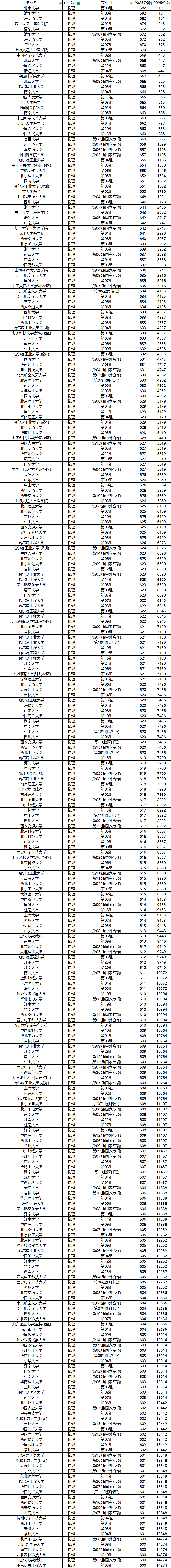 一、2025年全国本科院校在湖北物理类录取分数线