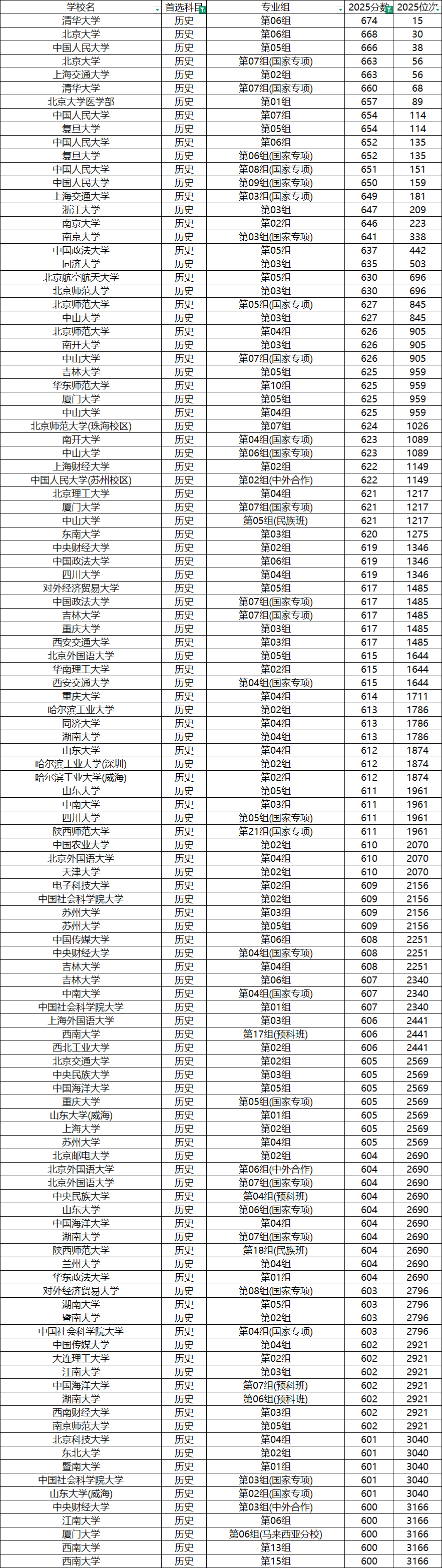 历史类招生计划相对较少,但竞争同样激烈,分数分布层次分明。