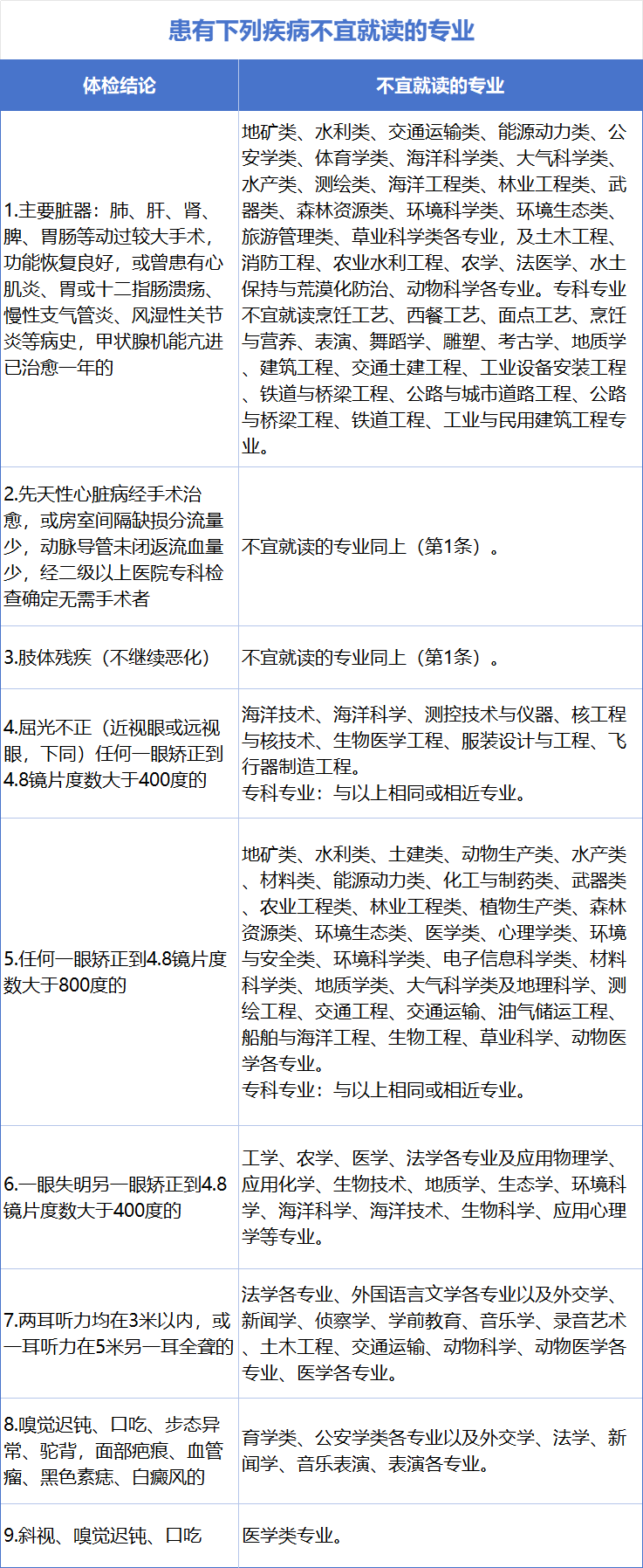 身体条件可能影响专业学习或就业(如近视度数过高不宜读海洋科学)。