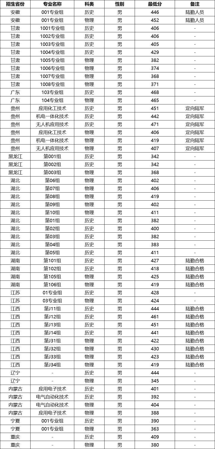 所有招生计划仅面向男生,选科要求涵盖历史类、物理类。从备注信息可以看出,所有专业均标注"陆勤人员"或"定向陆军",明确了毕业生的分配去向。在贵州等省份的招生中,明确标注"定向陆军",进一步确认了分配方向。