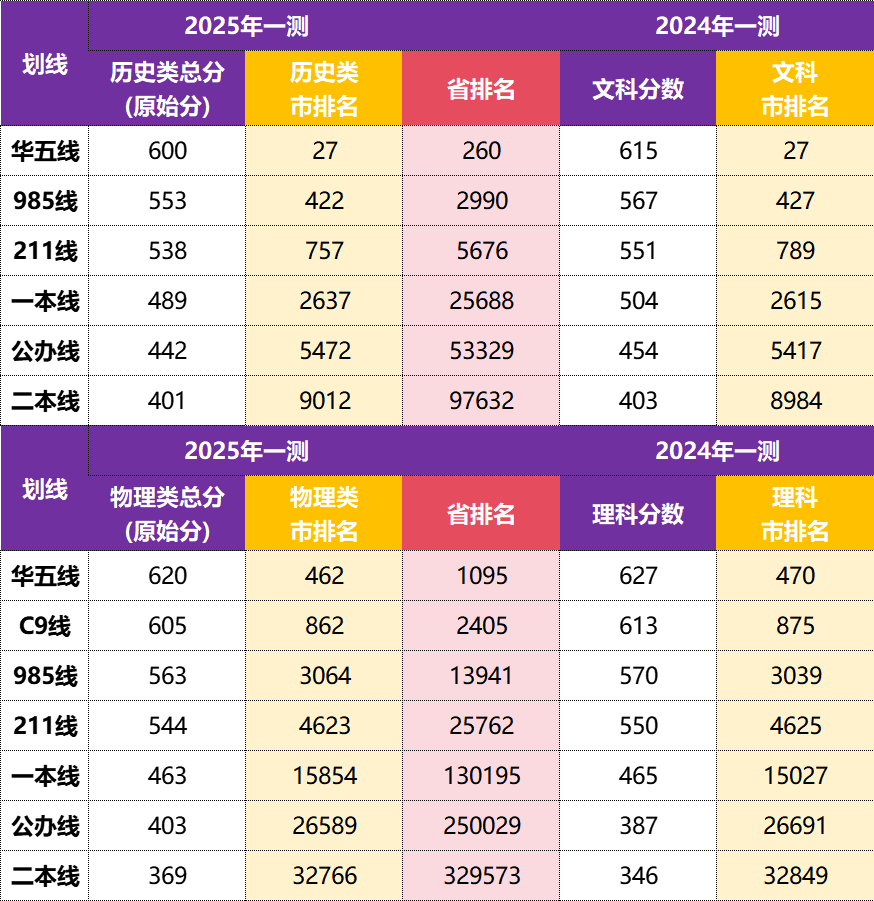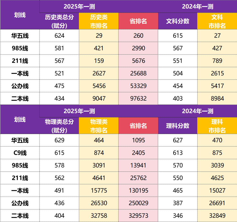 对比两年数据可以看出,不同批次线对应的市排名相对稳定。例如,历史类“985线”对应的市排名均在420名左右,物理类“211线”对应的市排名均在4600名左右。这意味着,考生在关注分数本身的同时,更应关注分数对应的市排名,这是判断自己是否达到某一批次门槛的更稳定指标。