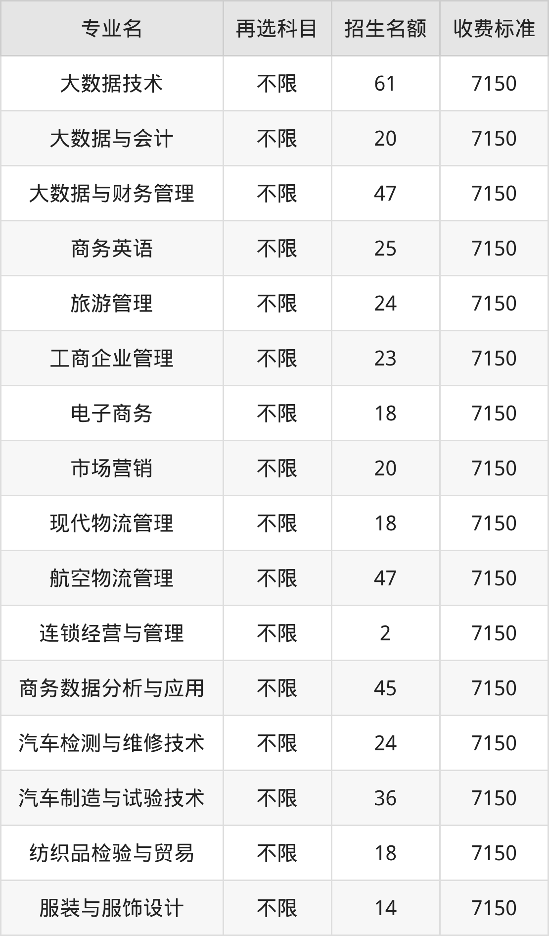 陕西工业职业技术大学在历史组高职专科批招生的各个专业,每年的学费是7150元。招生人数最多的专业是大数据技术,2025年招61人,学费是7150元。