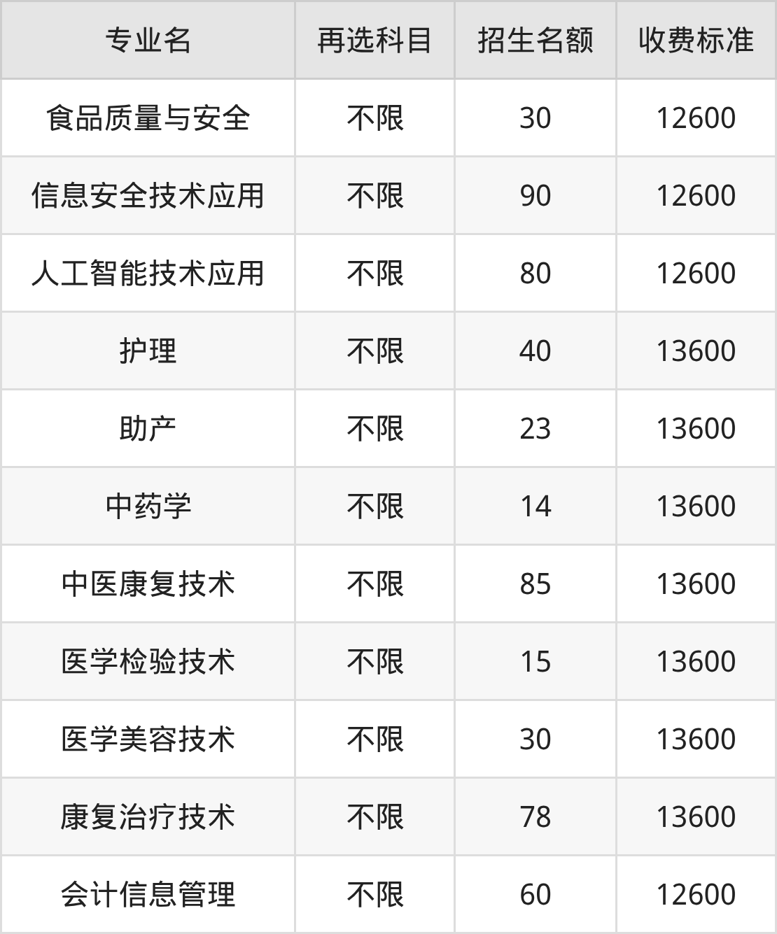 邯郸应用技术职业学院在历史组专科批招生的各个专业,每年的学费是12600元-13600元。招生人数最多的专业是信息安全技术应用,2025年招90人,学费是12600元。