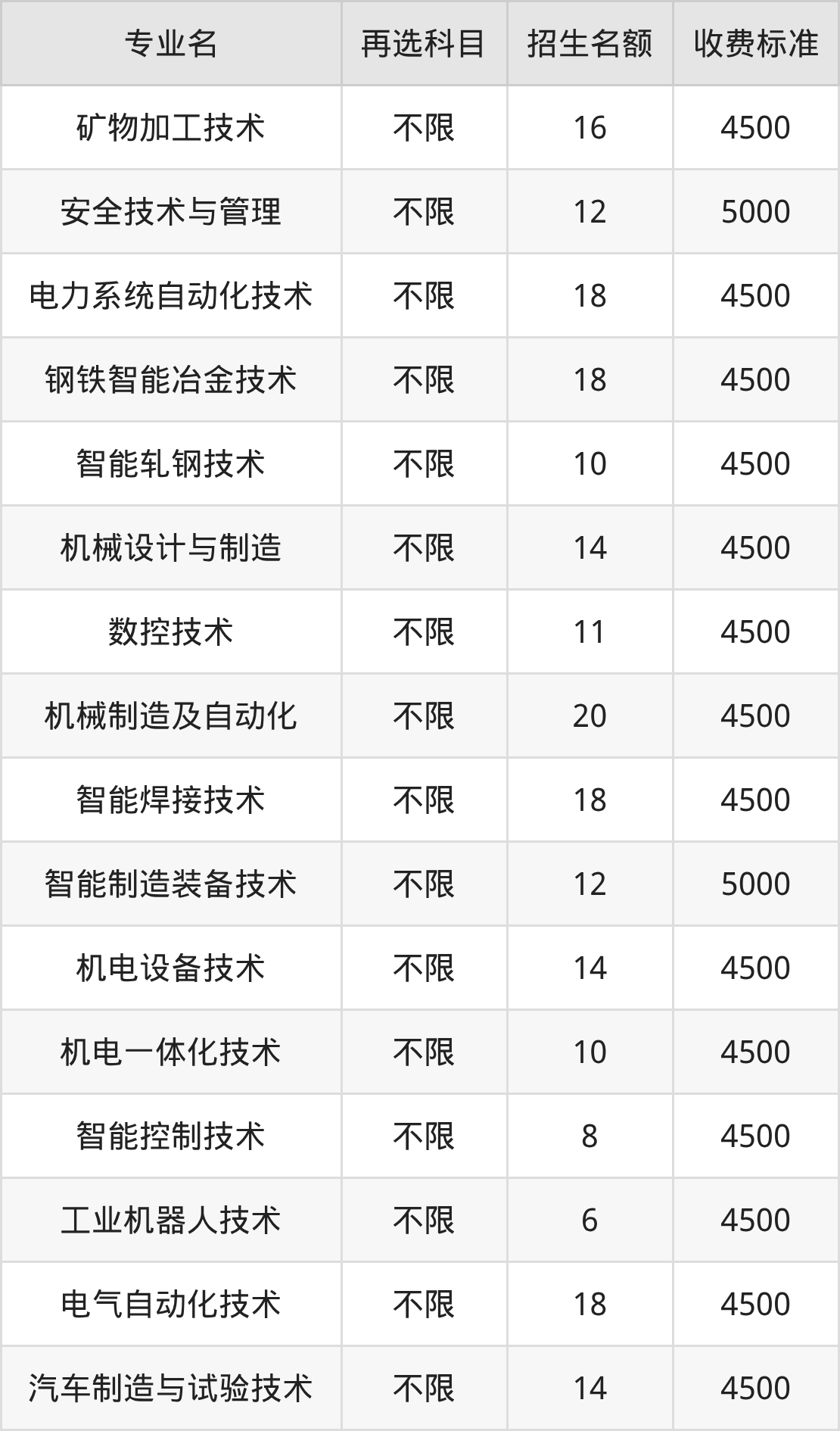 辽宁冶金职业技术学院在历史组高职专科批招生的各个专业,每年的学费是4500元-5000元。招生人数最多的专业是机械制造及自动化,2025年招20人,学费是4500元。