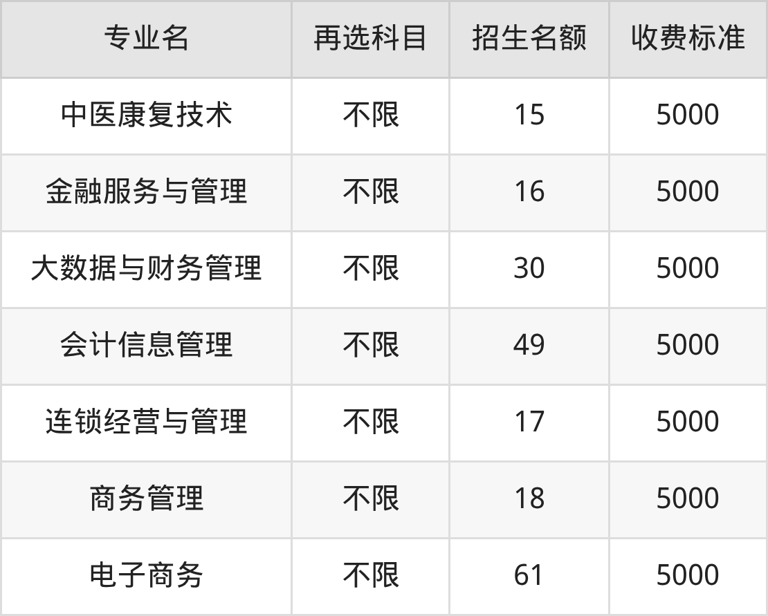 邯郸科技职业学院在历史组专科批招生的各个专业,每年的学费是5000元。招生人数最多的专业是电子商务,2025年招61人,学费是5000元。
