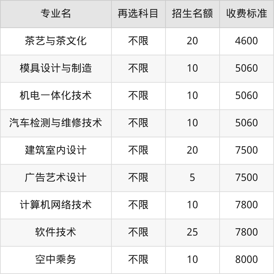 | 高职专科批 | 历史 | 空中乘务 | 10 |