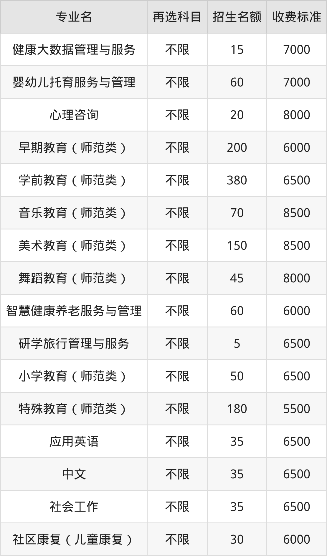 广西幼儿师范高等专科学校在历史组高职高专批招生的各个专业,每年的学费是5500元-12000元。招生人数最多的专业是学前教育,2025年招380人,学费是6500元。