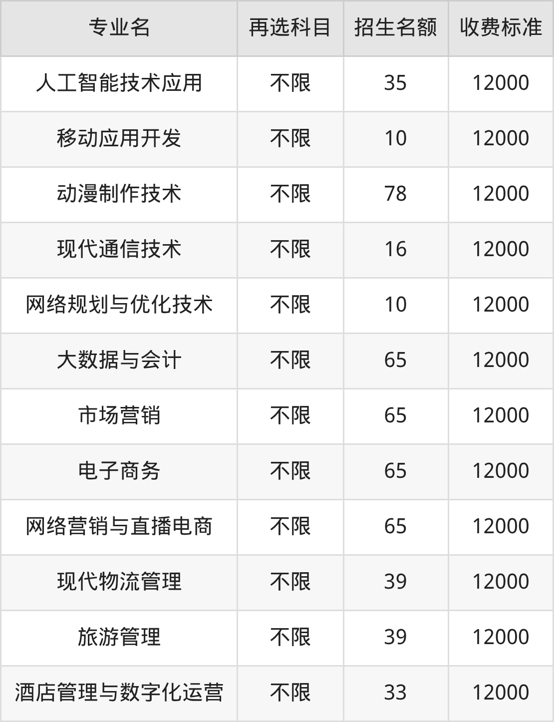 郑州电子信息职业技术学院在历史组高职专科批招生的各个专业,每年的学费是12000元。招生人数最多的专业是动漫制作技术,2025年招78人,学费是12000元。