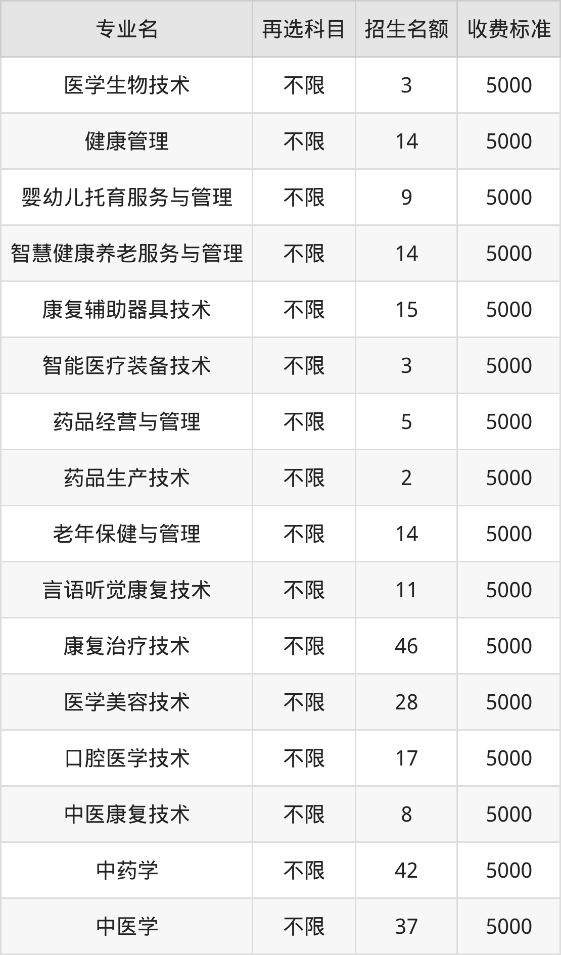 赣南卫生健康职业学院在历史组专科提前批招生的各个专业,每年的学费是5000元。招生人数最多的专业是中医学,2024年招3人,学费是5000元。