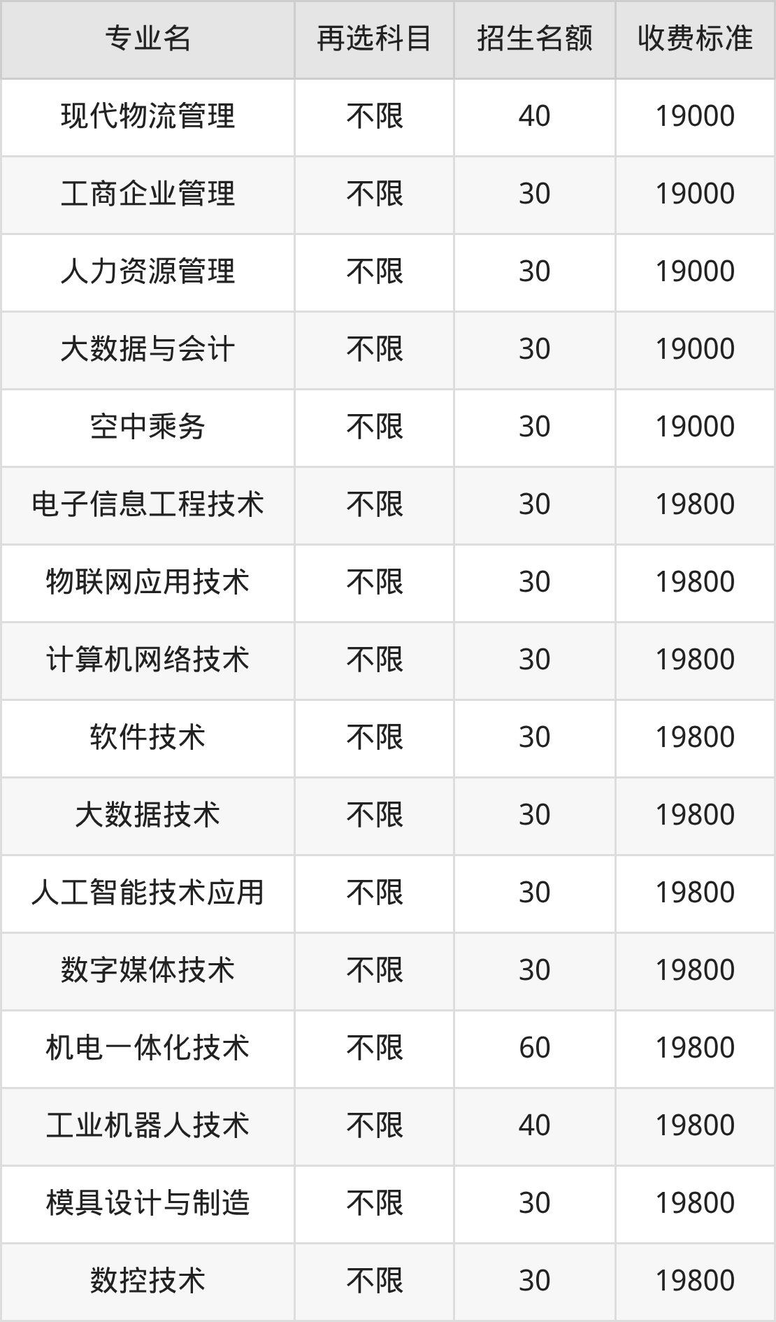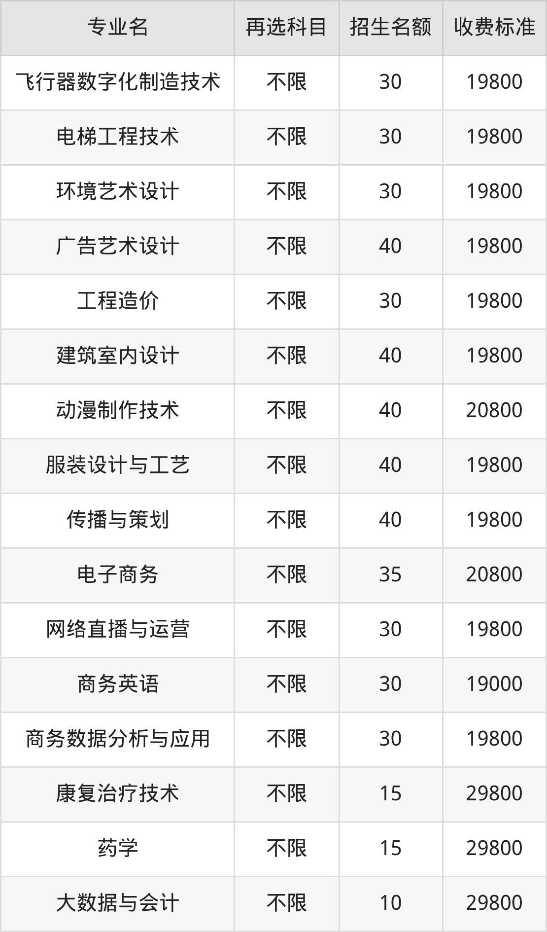 | 专科高职批 | 历史 | 空中乘务 | 30 |