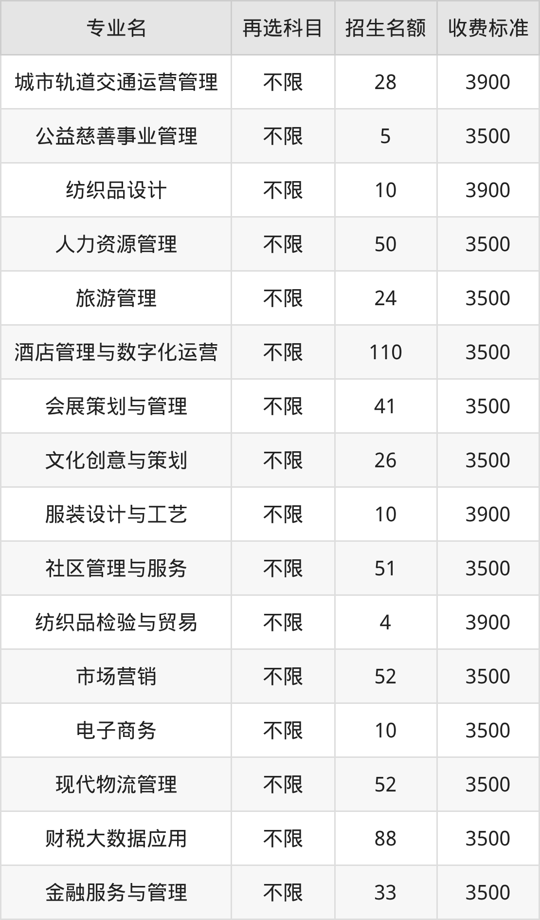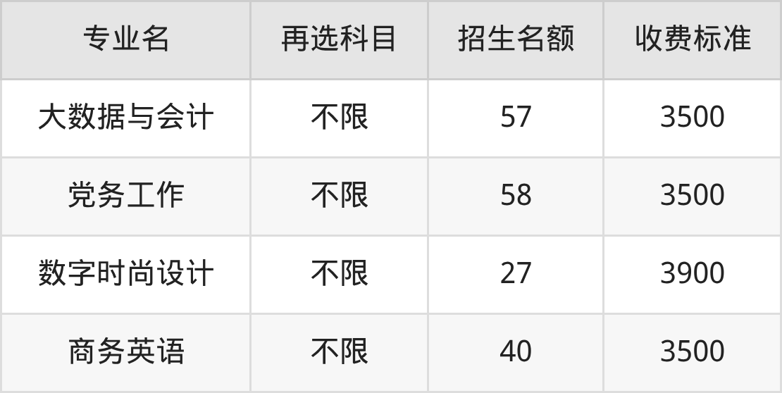安徽职业技术大学在历史组高职专科批招生的各个专业,每年的学费是3500元-3900元。招生人数最多的专业是酒店管理与数字化运营,2025年招110人,学费是3500元。