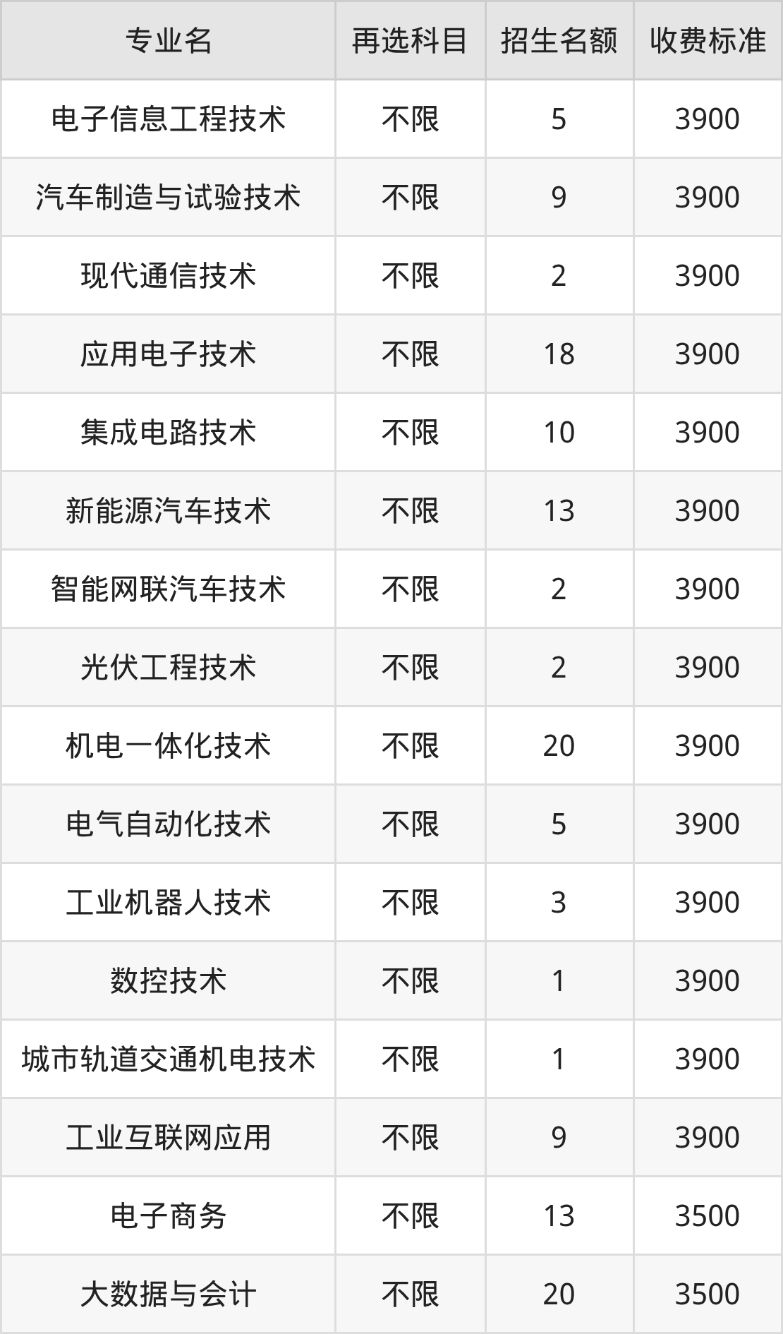 安徽电子信息职业技术学院在历史组高职专科批招生的各个专业,每年的学费是3500元-7800元。招生人数最多的专业是跨境电子商务,2025年招30人,学费是3500元。