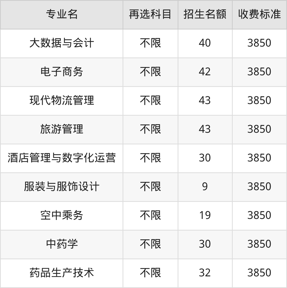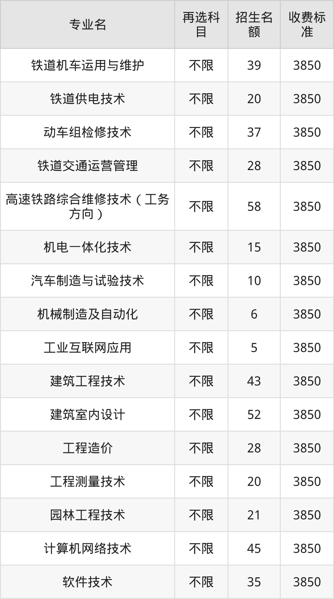 贵阳职业技术学院在历史组高职专科批招生的各个专业,每年的学费是3850元。招生人数最多的专业是高速铁路综合维修技术,2025年招58人,学费是3850元。