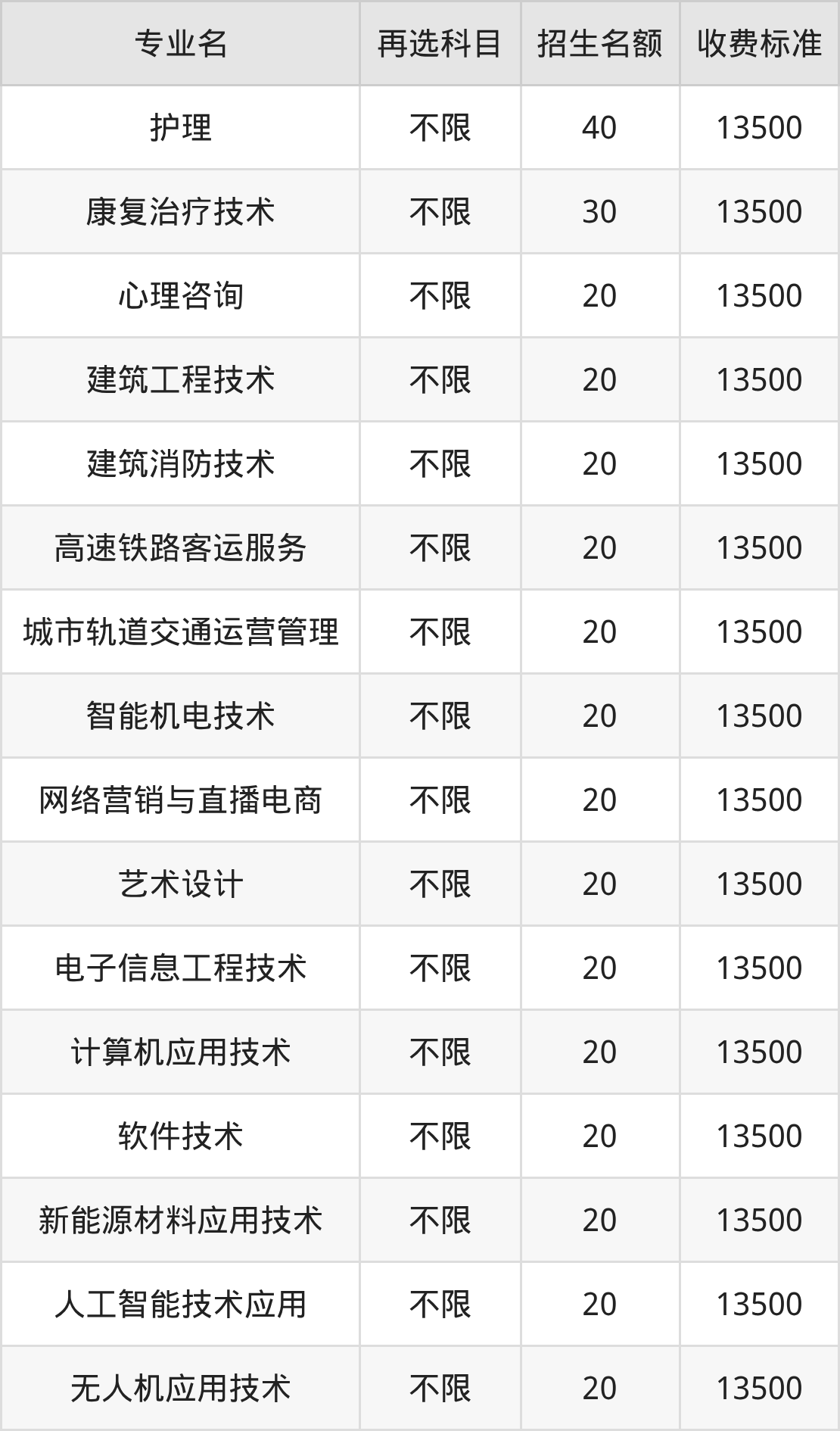 遂宁职业学院在历史组高职专科批招生的各个专业,每年的学费是13500元。招生人数最多的专业是护理,2025年招40人,学费是13500元。