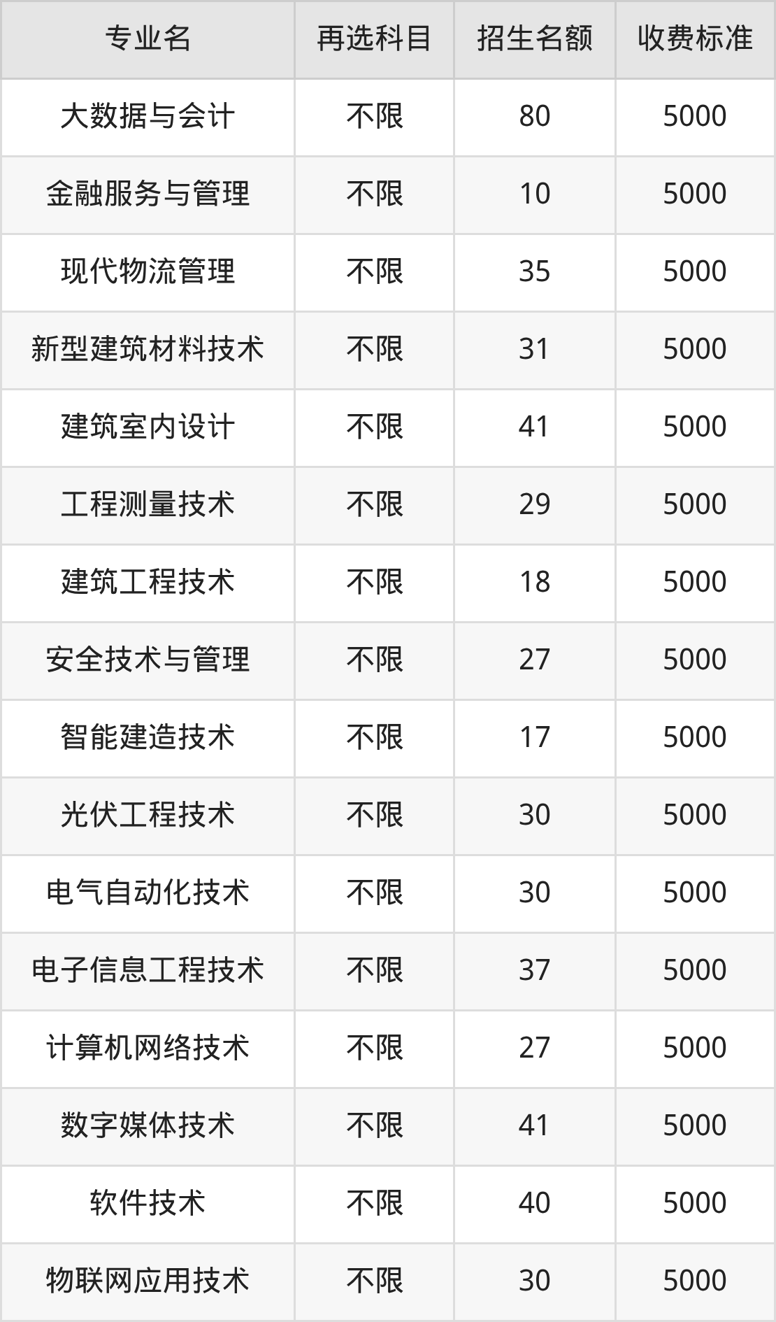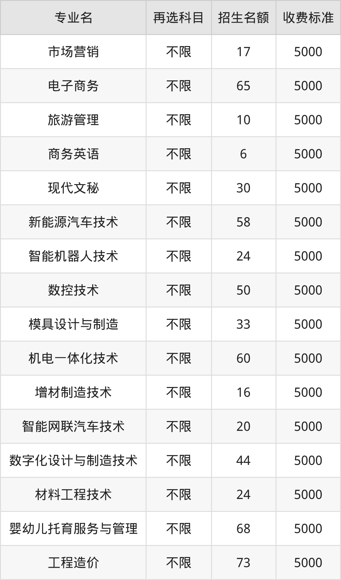 江西工业工程职业技术学院在历史组高职专科批招生的各个专业,每年的学费是5000元。招生人数最多的专业是大数据与会计,2025年招80人,学费是5000元。
