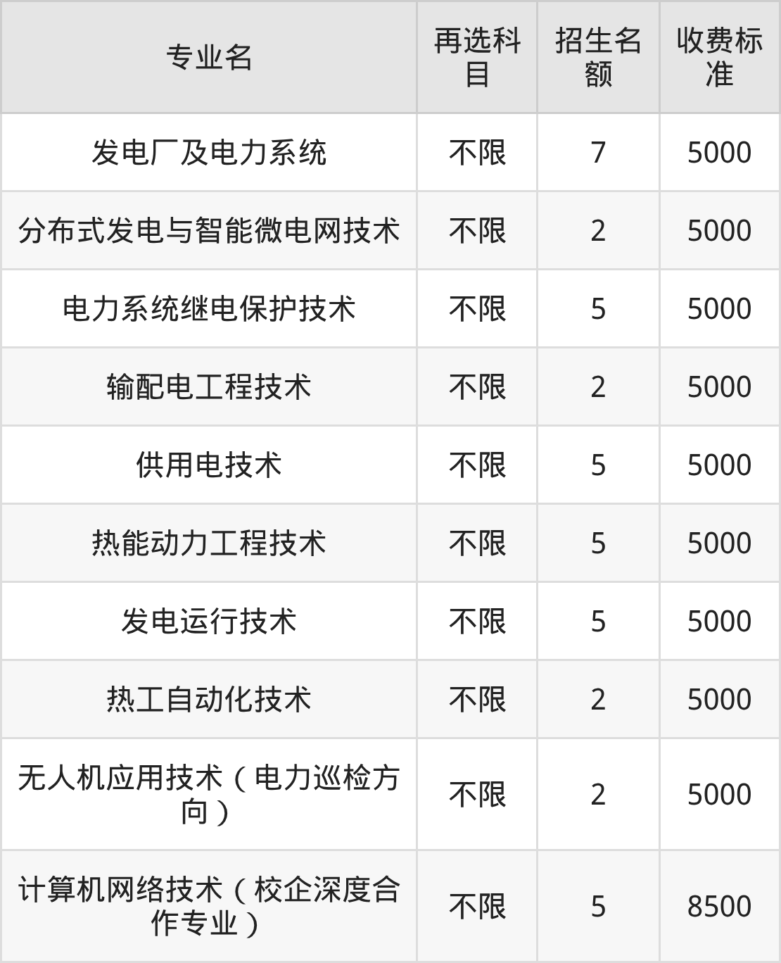保定电力职业技术学院在历史组专科批招生的各个专业,每年的学费是5000元-8500元。招生人数最多的专业是发电厂及电力系统,2025年招7人,学费是5000元。