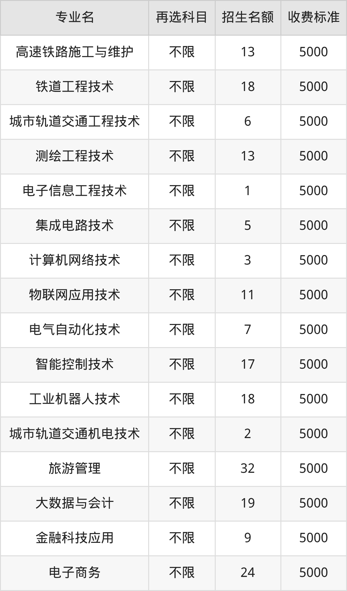武汉铁路职业技术学院在历史组高职高专批招生的各个专业,每年的学费是5000元。招生人数最多的专业是旅游管理,2025年招32人,学费是5000元。