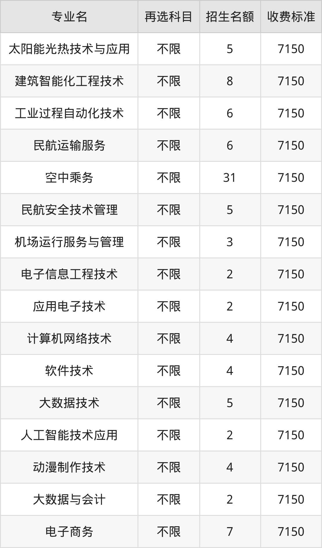 西安航空职业技术学院在历史组高职专科批招生的各个专业,每年的学费是7150元。招生人数最多的专业是空中乘务,2025年招31人,学费是7150元。