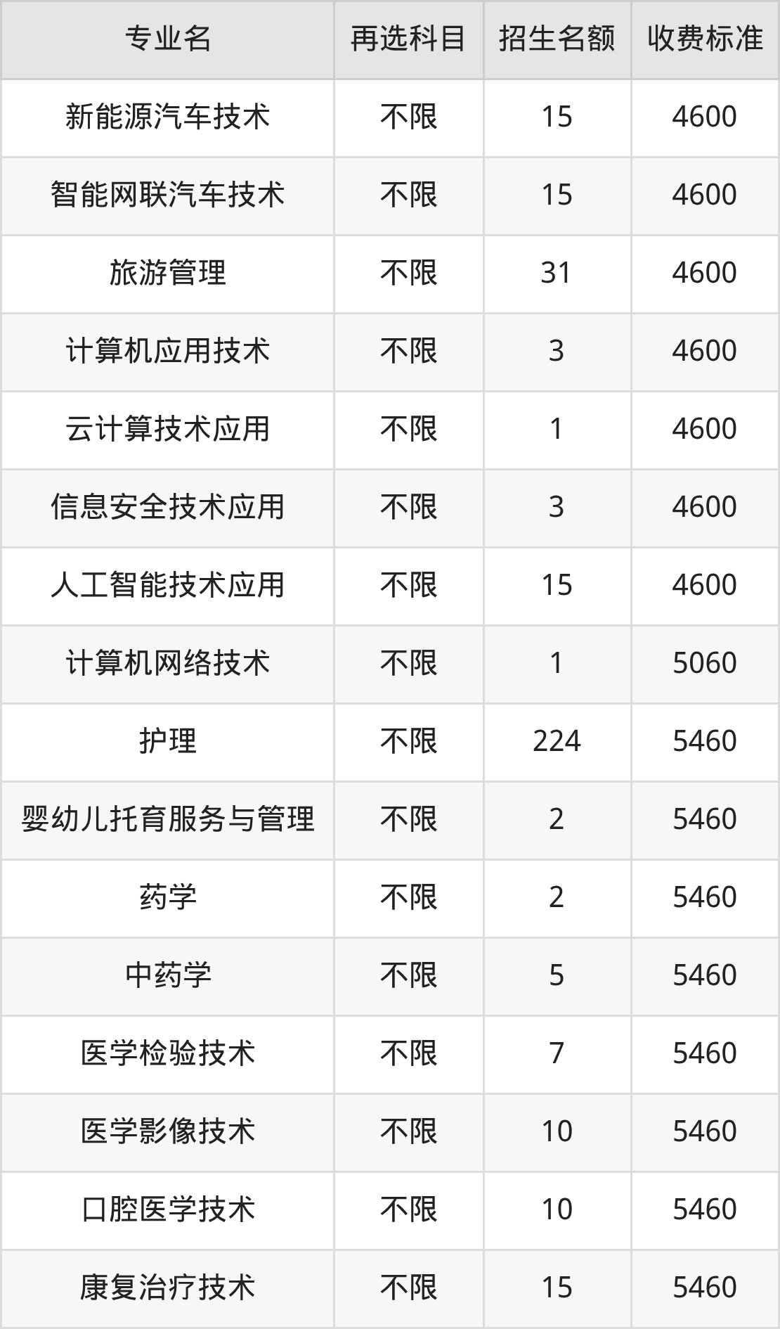 永州职业技术学院在历史组高职专科批招生的各个专业,每年的学费是3000元-16500元。招生人数最多的专业是护理,2025年招224人,学费是5460元。