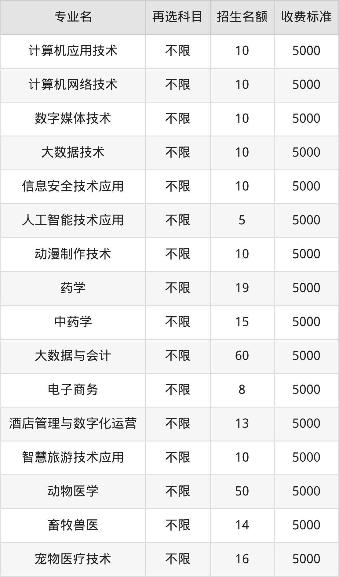 湖北生物科技职业学院在历史组高职高专批招生的各个专业,每年的学费是5000元。招生人数最多的专业是大数据与会计,2025年招60人,学费是5000元。