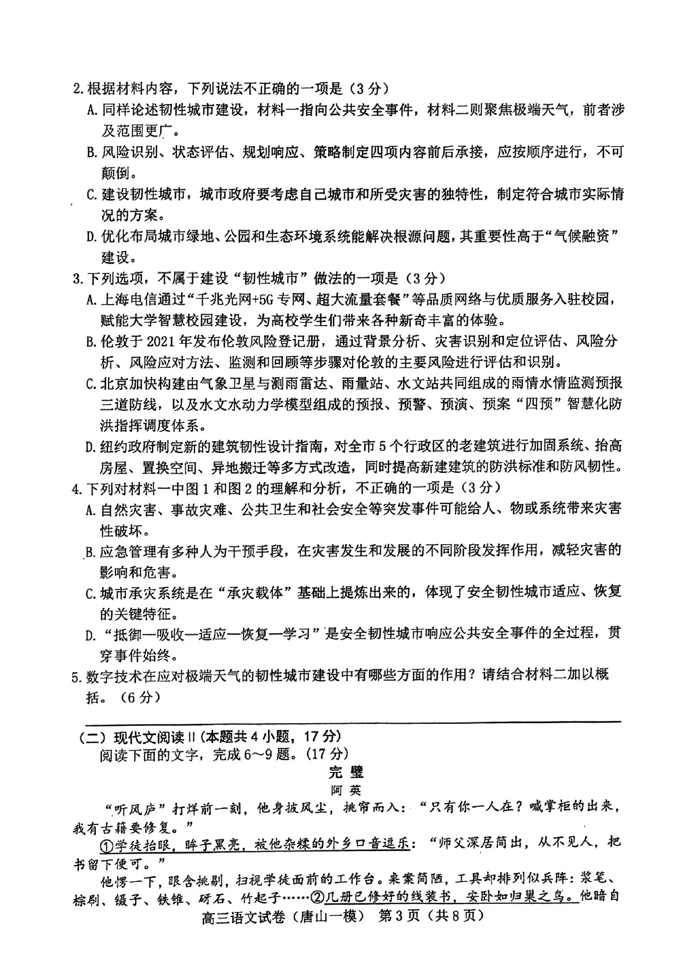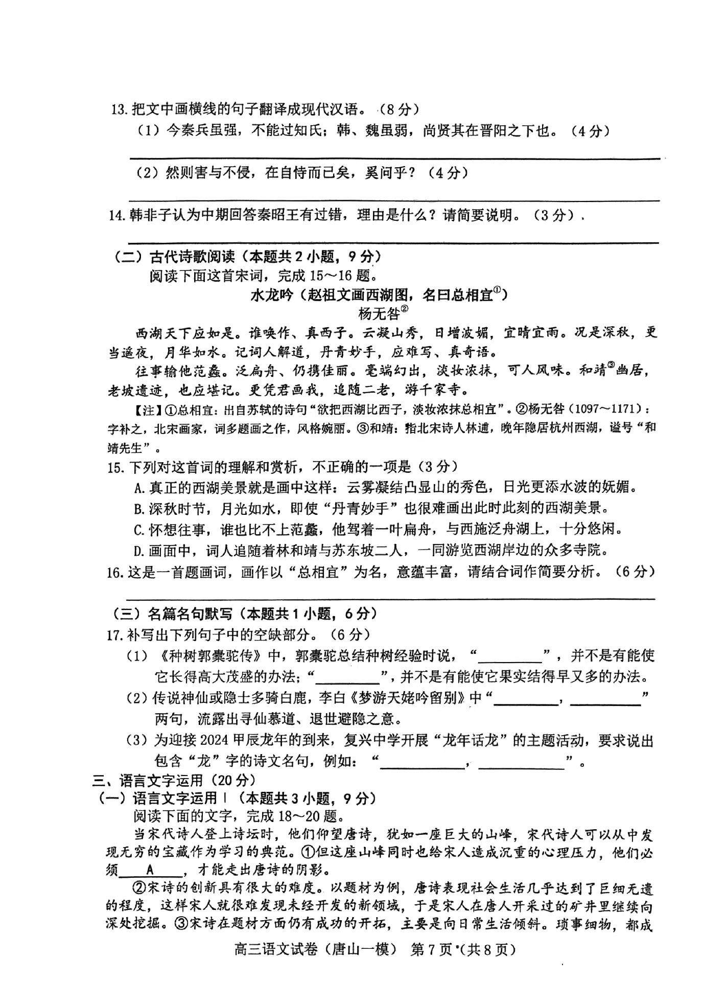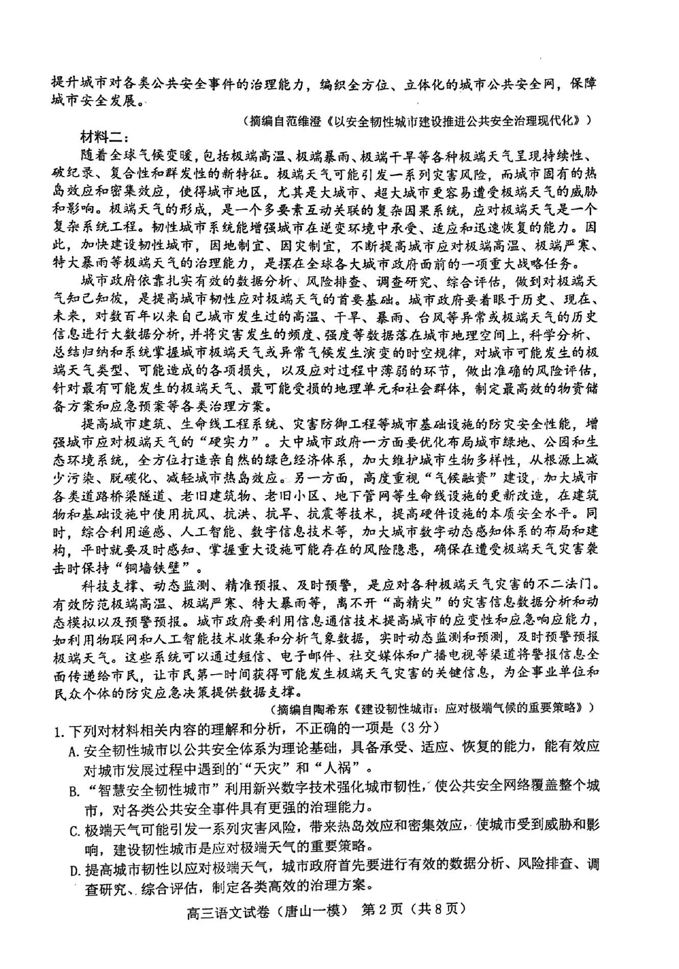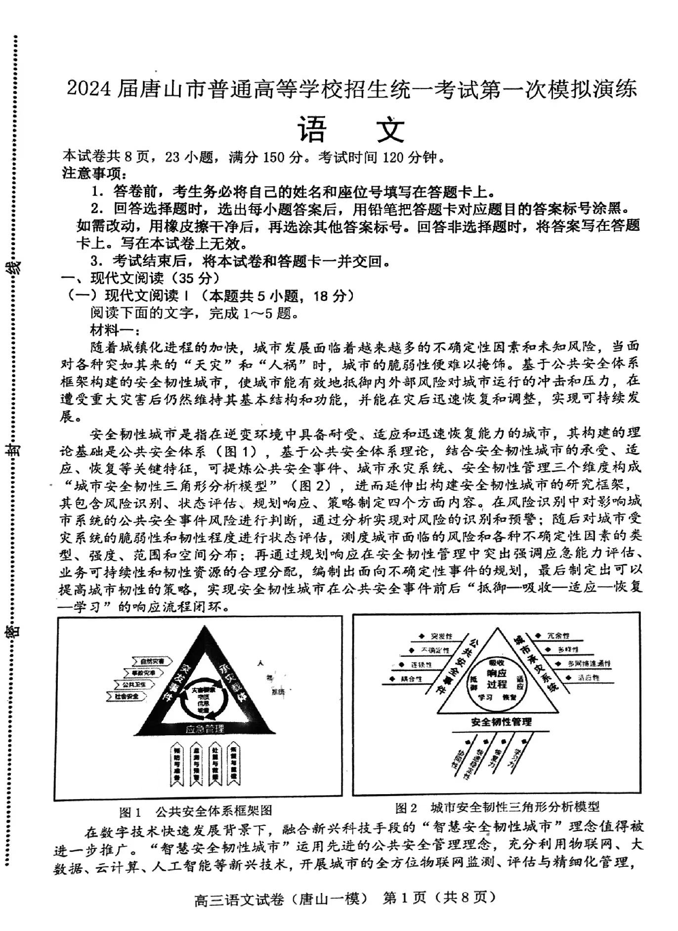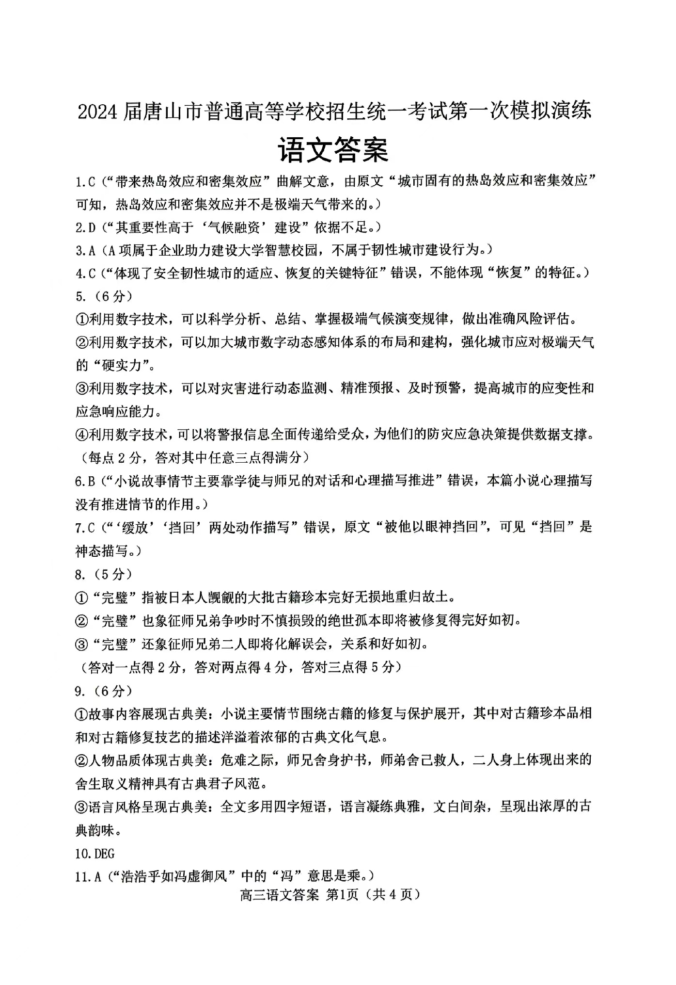 一、2024唐山一模语文答案及试卷