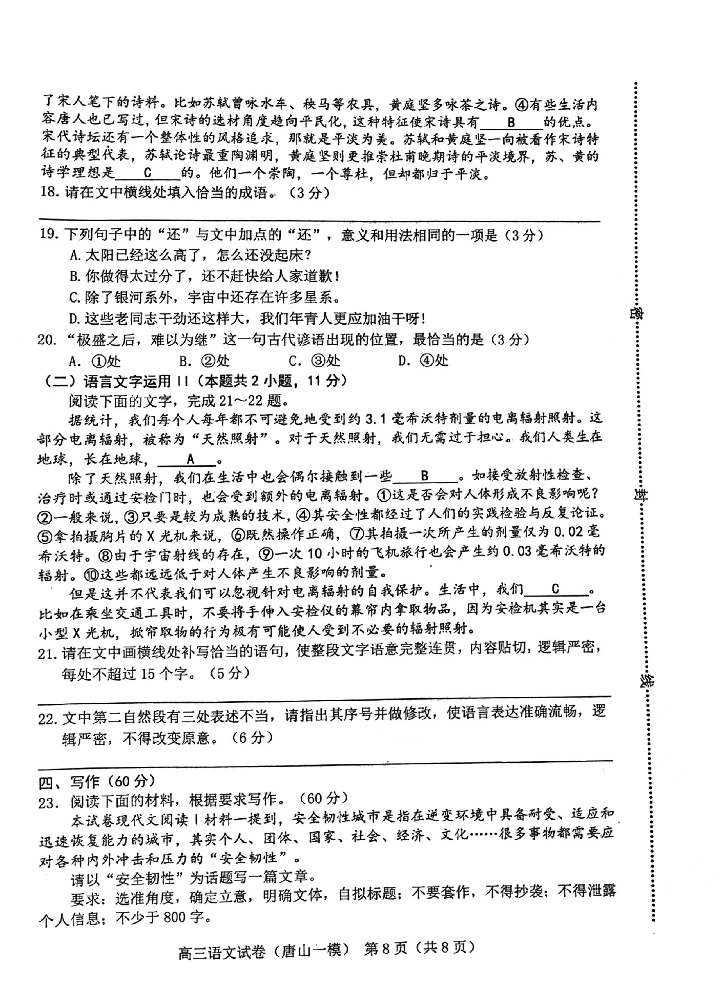 四、2024唐山一模英语答案及试卷