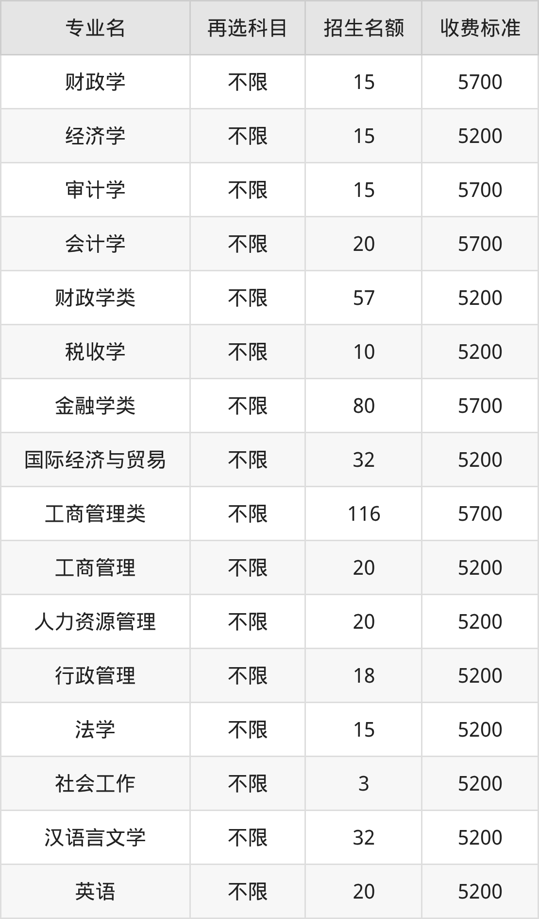 二、南京财经大学各专业收费标准
