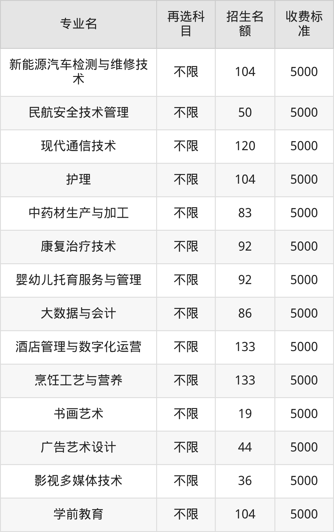 一、云南现代职业技术学院各专业收费标准