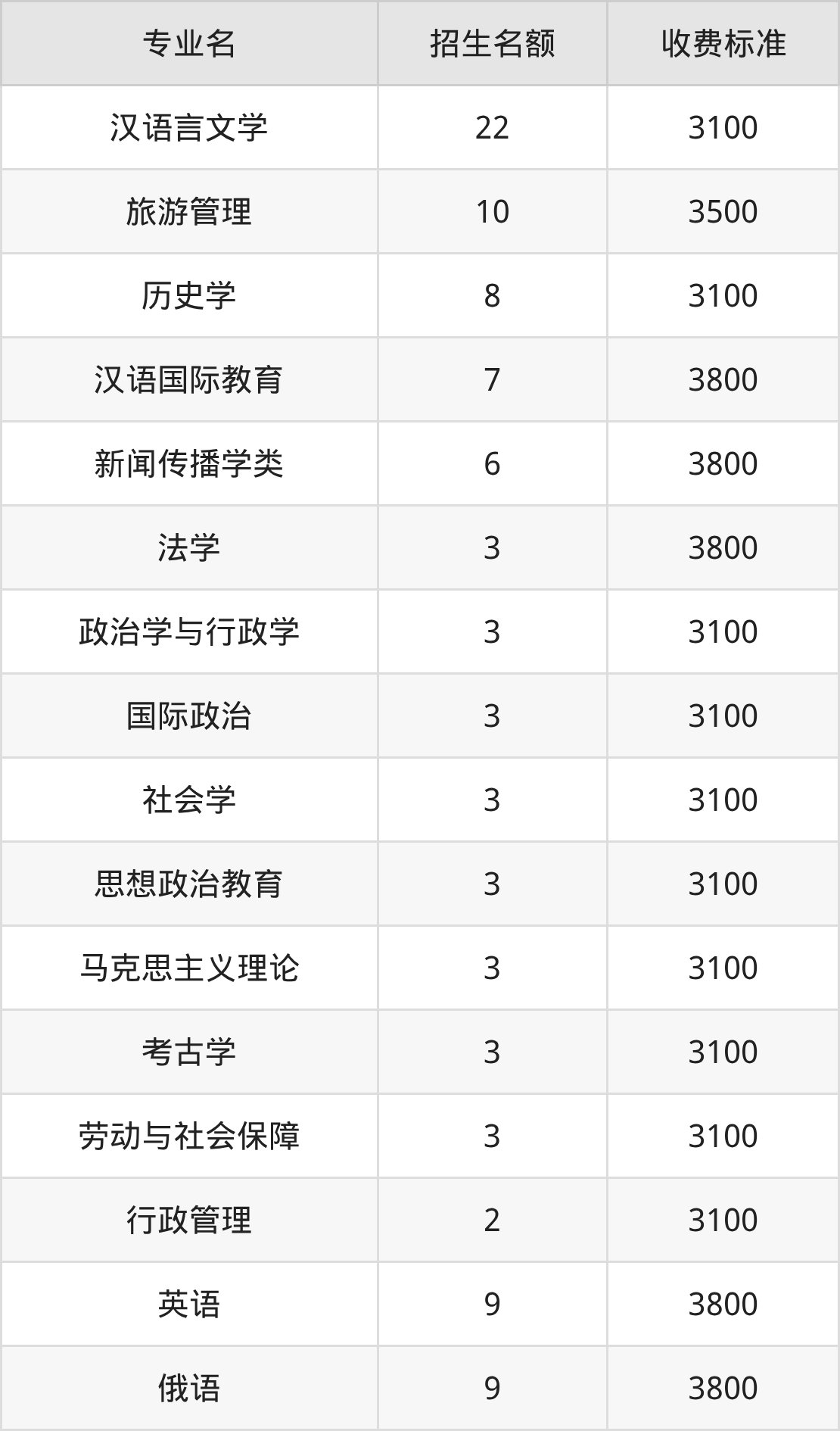 新疆大学在文科本科一批招生的各个专业,每年的学费是3100元-3800元。招生人数最多的专业是汉语言文学,2025年招22人,学费是3100元。