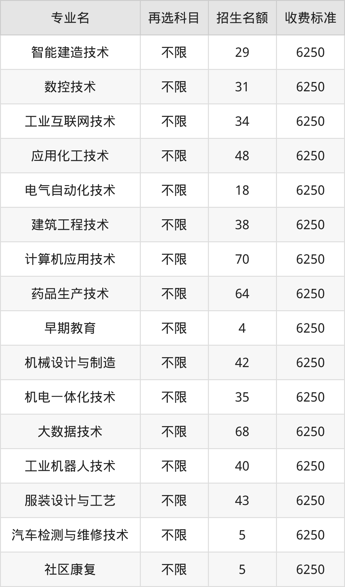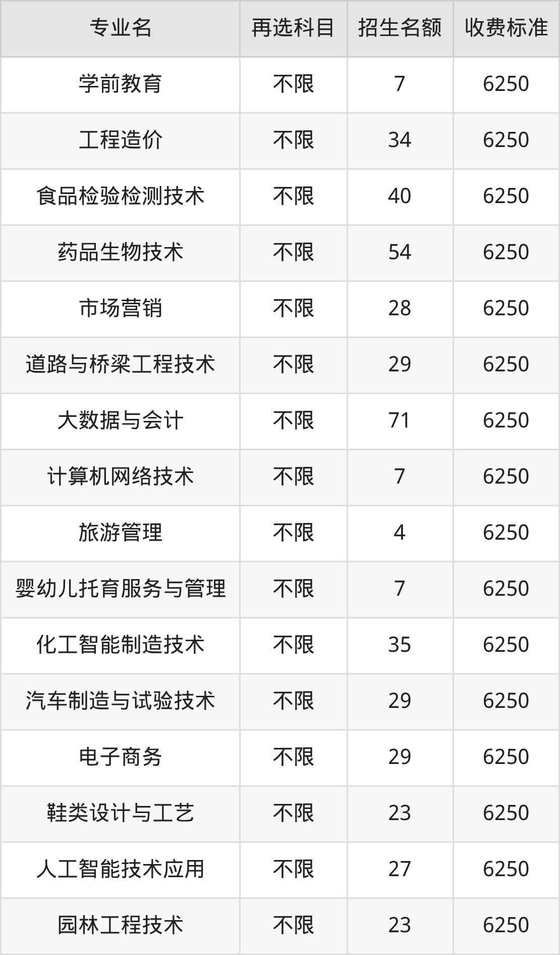 重庆工贸职业技术学院在历史组高职专科批招生的各个专业,每年的学费是6250元。招生人数最多的专业是大数据与会计,2025年招71人,学费是6250元。