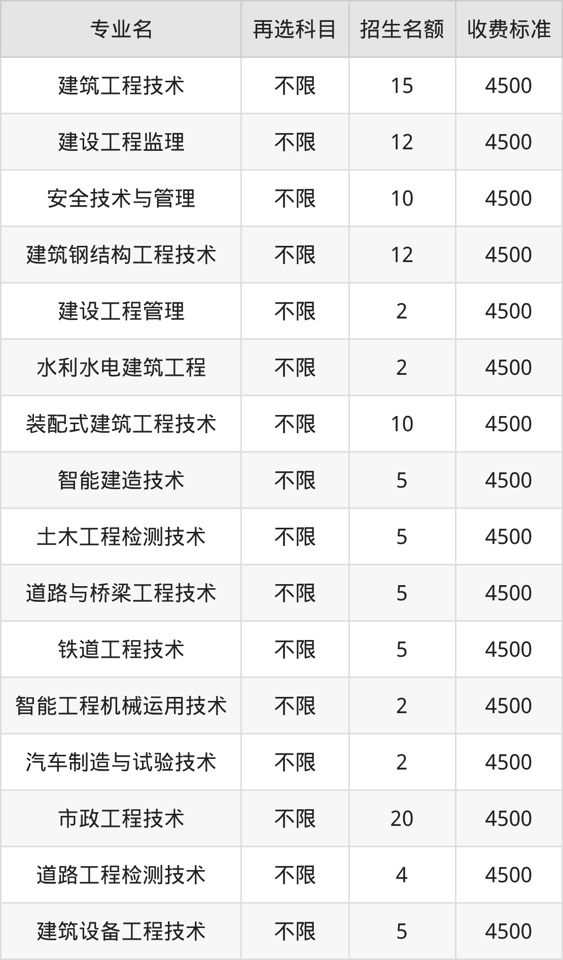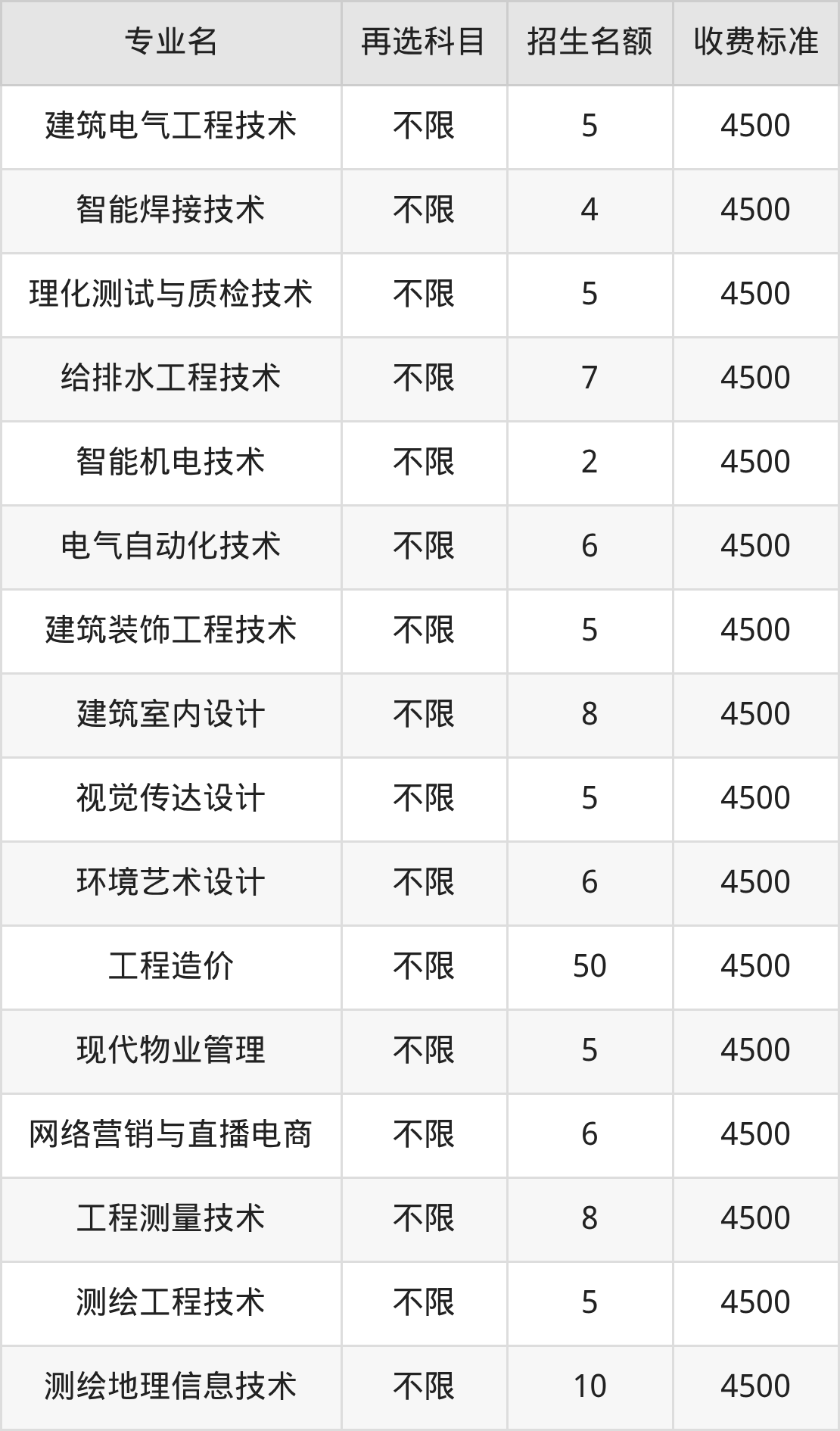甘肃建筑职业技术学院在历史组高职专科批招生的各个专业,每年的学费是4500元。招生人数最多的专业是工程造价,2025年招50人,学费是4500元。