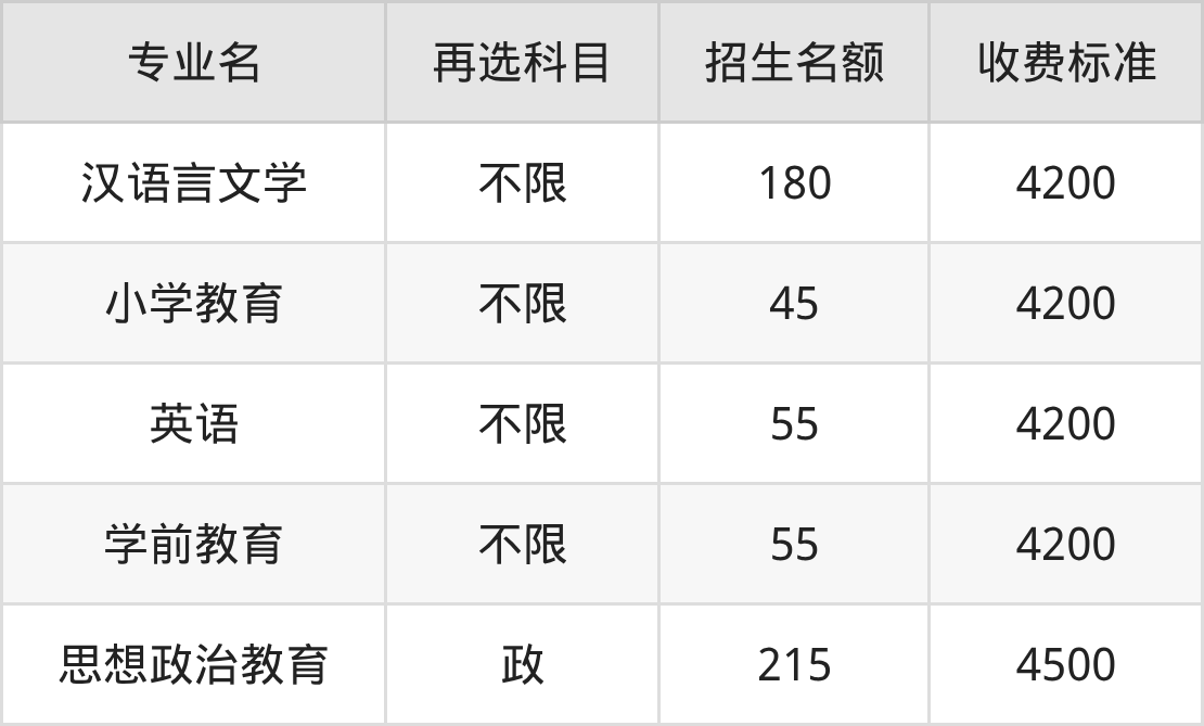 丽江师范学院在历史组本科批B段招生的各个专业,每年的学费是4200元-4500元。招生人数最多的专业是思想政治教育,2025年招215人,学费是4500元。