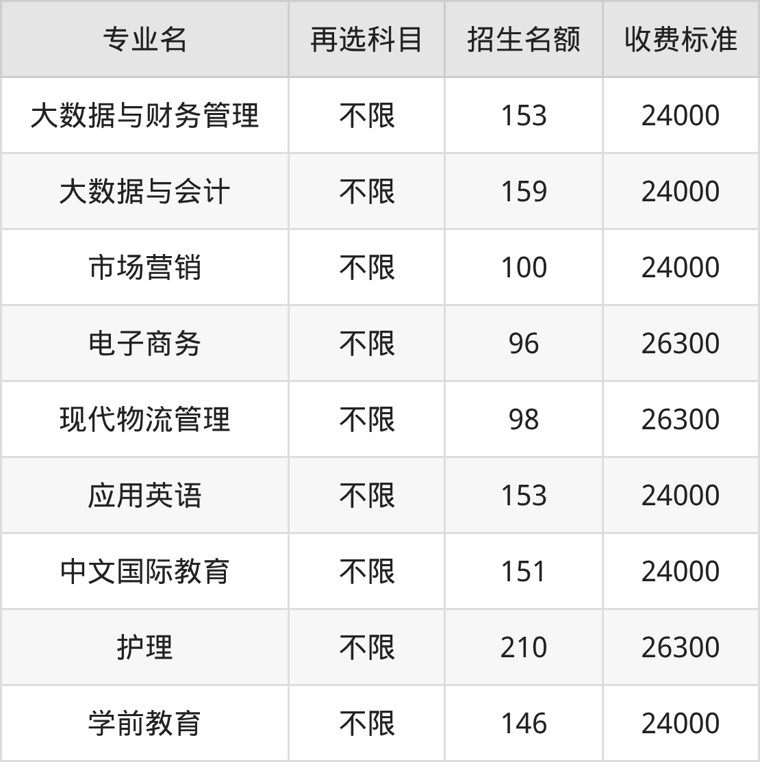 南昌职业大学在历史组本科批招生的各个专业,每年的学费是24000元-26300元。招生人数最多的专业是护理,2025年招210人,学费是26300元。