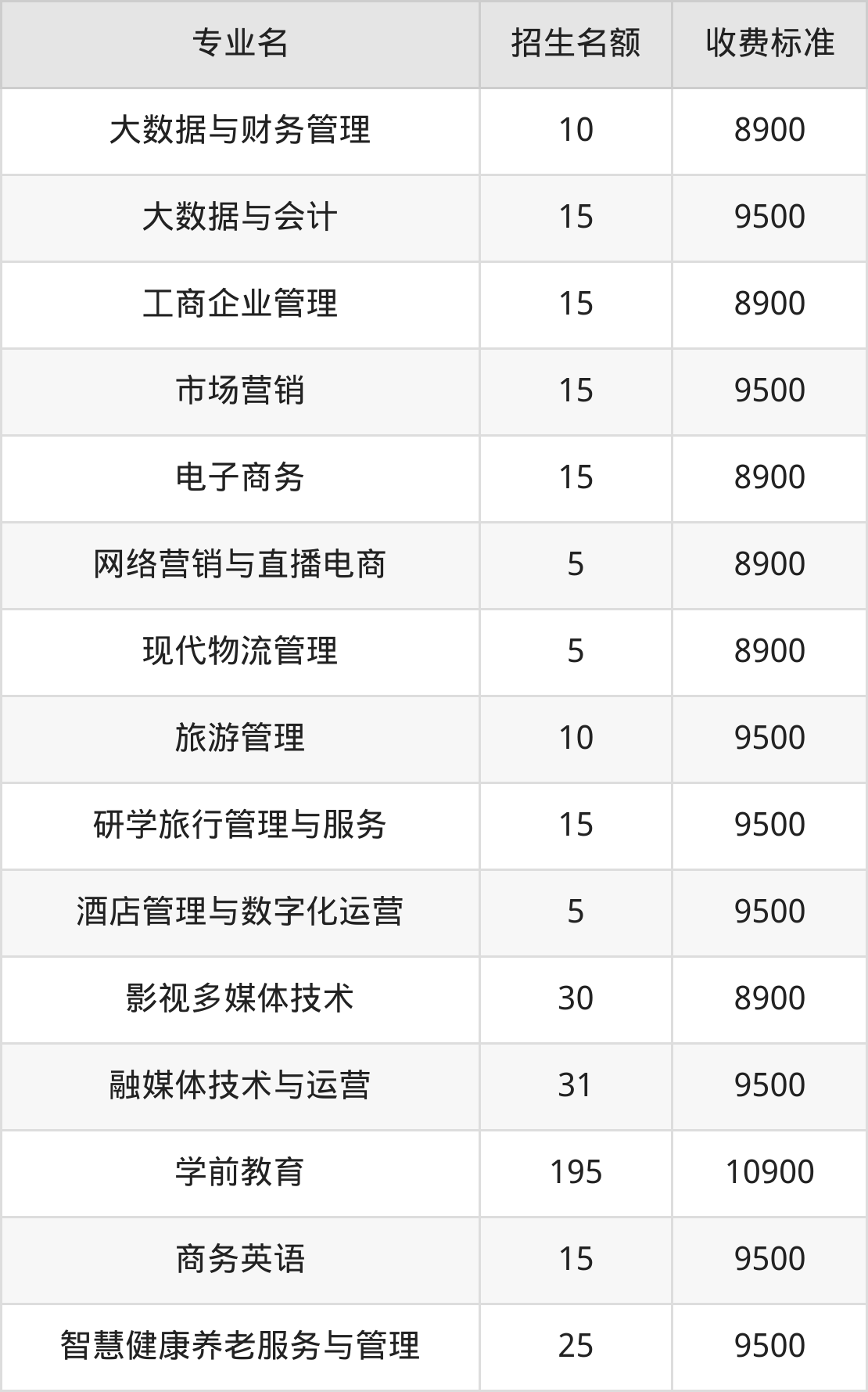 焦作工贸职业学院在文科高职专科批招生的各个专业,每年的学费是8900元-13000元。招生人数最多的专业是学前教育,2024年招195人,学费是10900元。