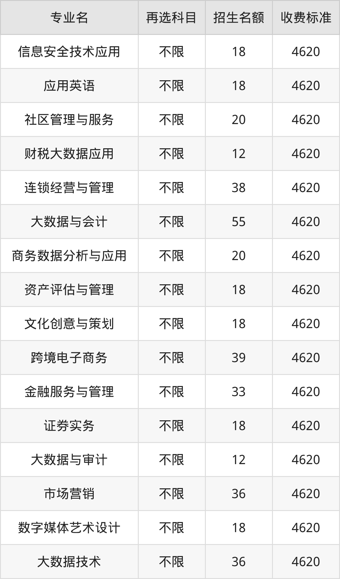 宁夏财经职业技术学院在历史组高职专科批招生的各个专业,每年的学费是4620元。招生人数最多的专业是大数据与会计,2025年招55人,学费是4620元。