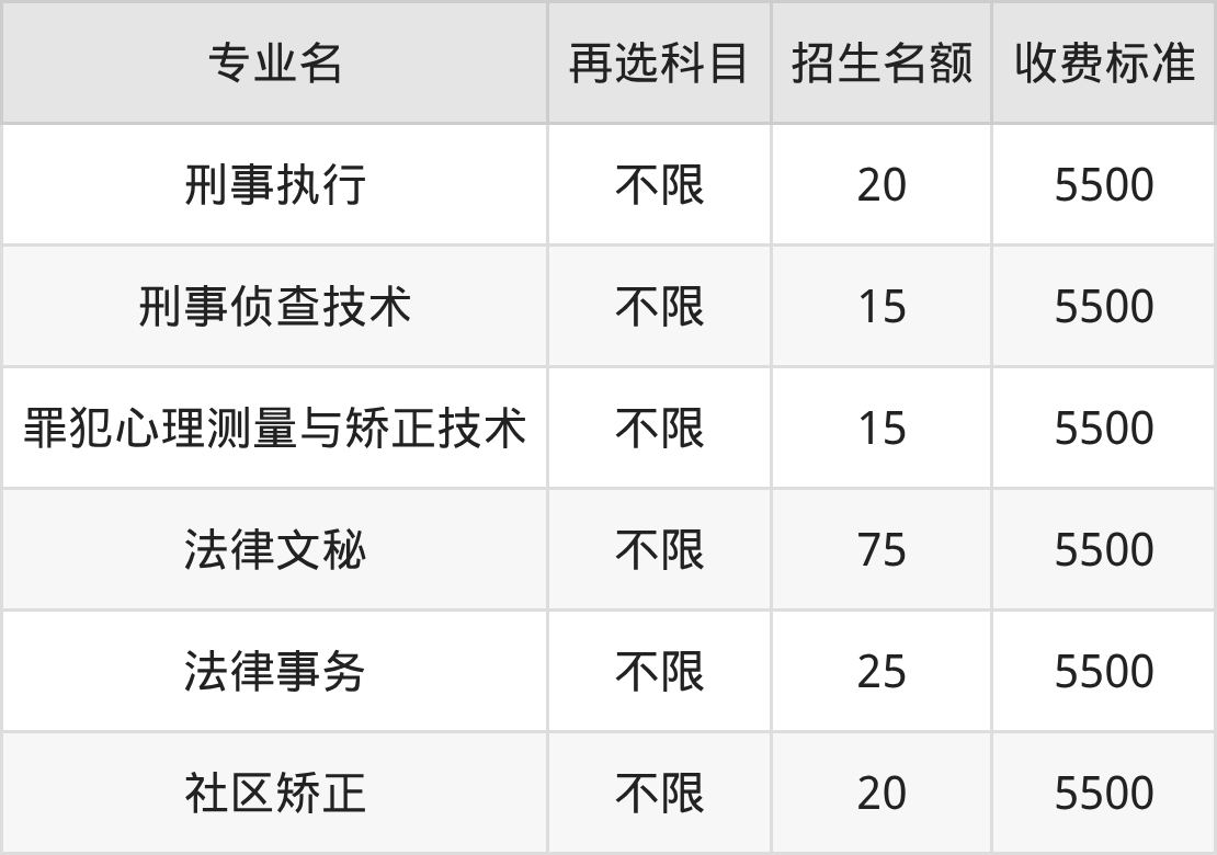 江苏司法警官职业学院在历史组专科批招生的各个专业,每年的学费是5500元。招生人数最多的专业是法律文秘,2025年招75人,学费是5500元。