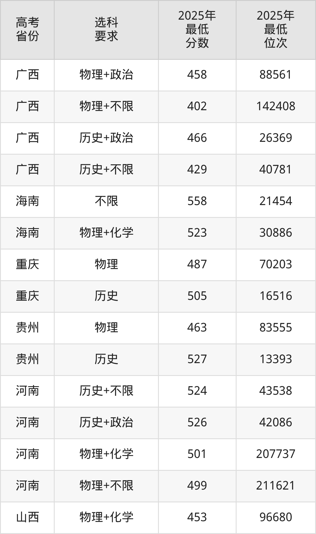 在2025年广西高考物理类招生时,211收分最低的是东北农业大学104组,最低分是381分、位次是163558位。再看河池学院,2025年在广西物理类的最低录取分数线是402分,最低位次是142408位。