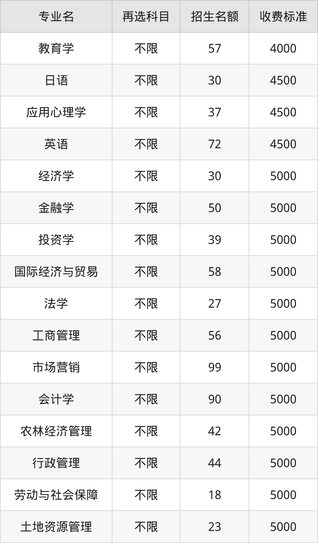湖南农业大学在历史组本科批招生的各个专业,每年的学费是4000元-20000元。招生人数最多的专业是市场营销,2025年招99人,学费是5000元。