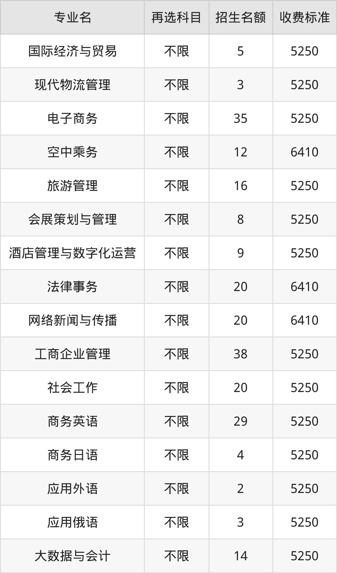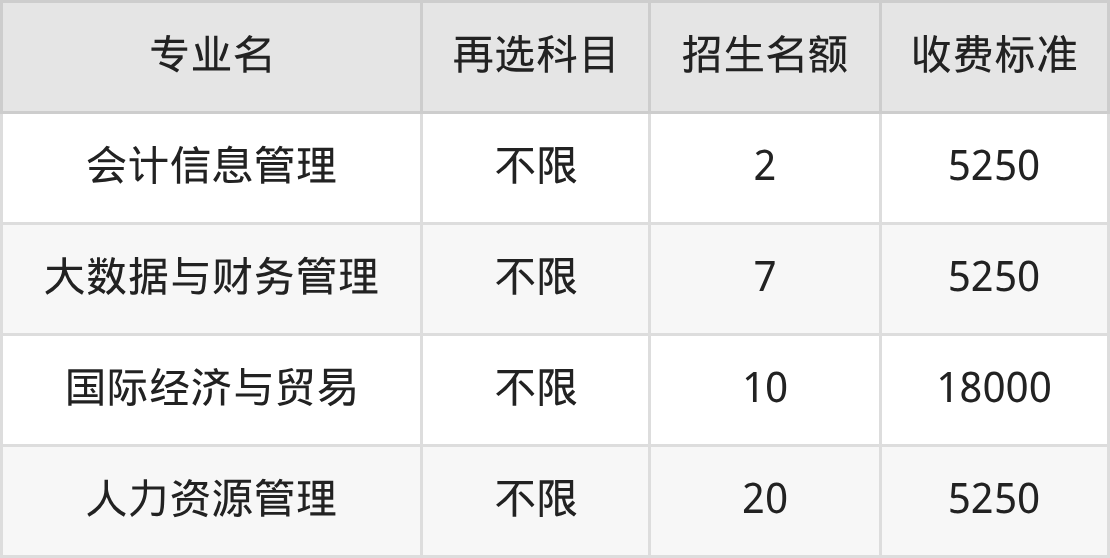 | 专科高职批 | 历史 | 国际经济与贸易 | 10 |