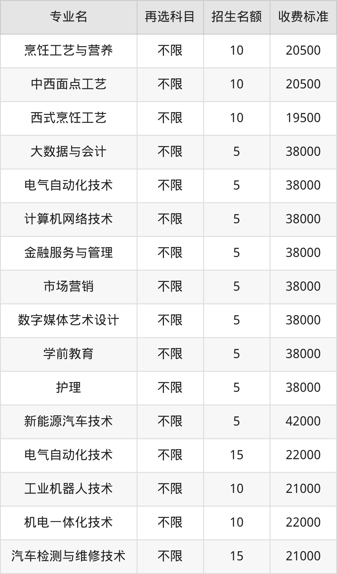 | 专科高职批 | 历史 | 西式烹饪工艺 | 10 |