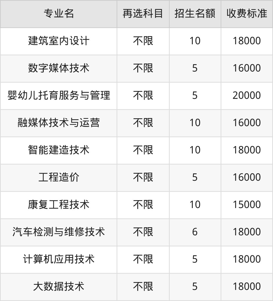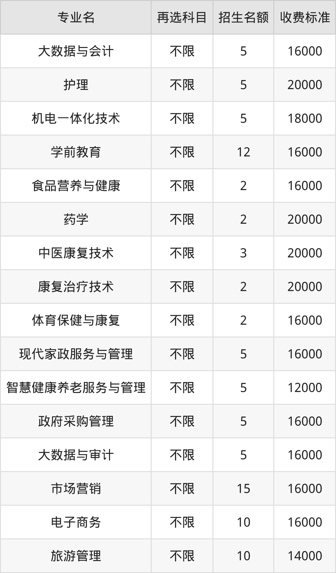 钟山职业技术学院在历史组专科批招生的各个专业,每年的学费是12000元-20000元。招生人数最多的专业是市场营销,2025年招15人,学费是16000元。