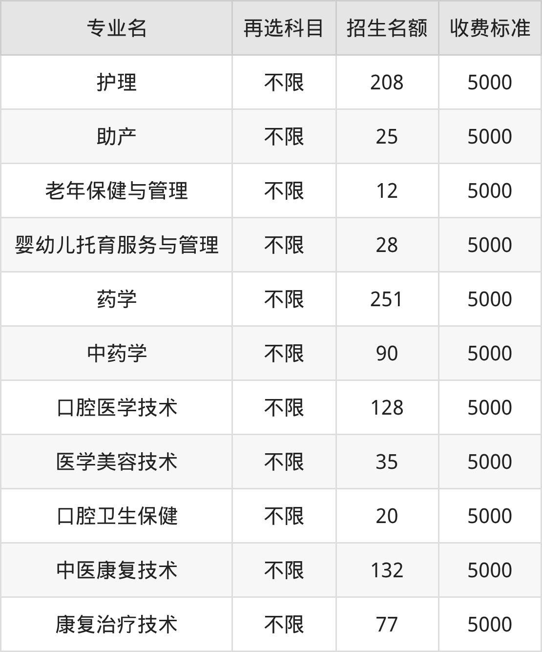 南昌健康职业技术学院在历史组高职专科批招生的各个专业,每年的学费是5000元。招生人数最多的专业是药学,2025年招251人,学费是5000元。