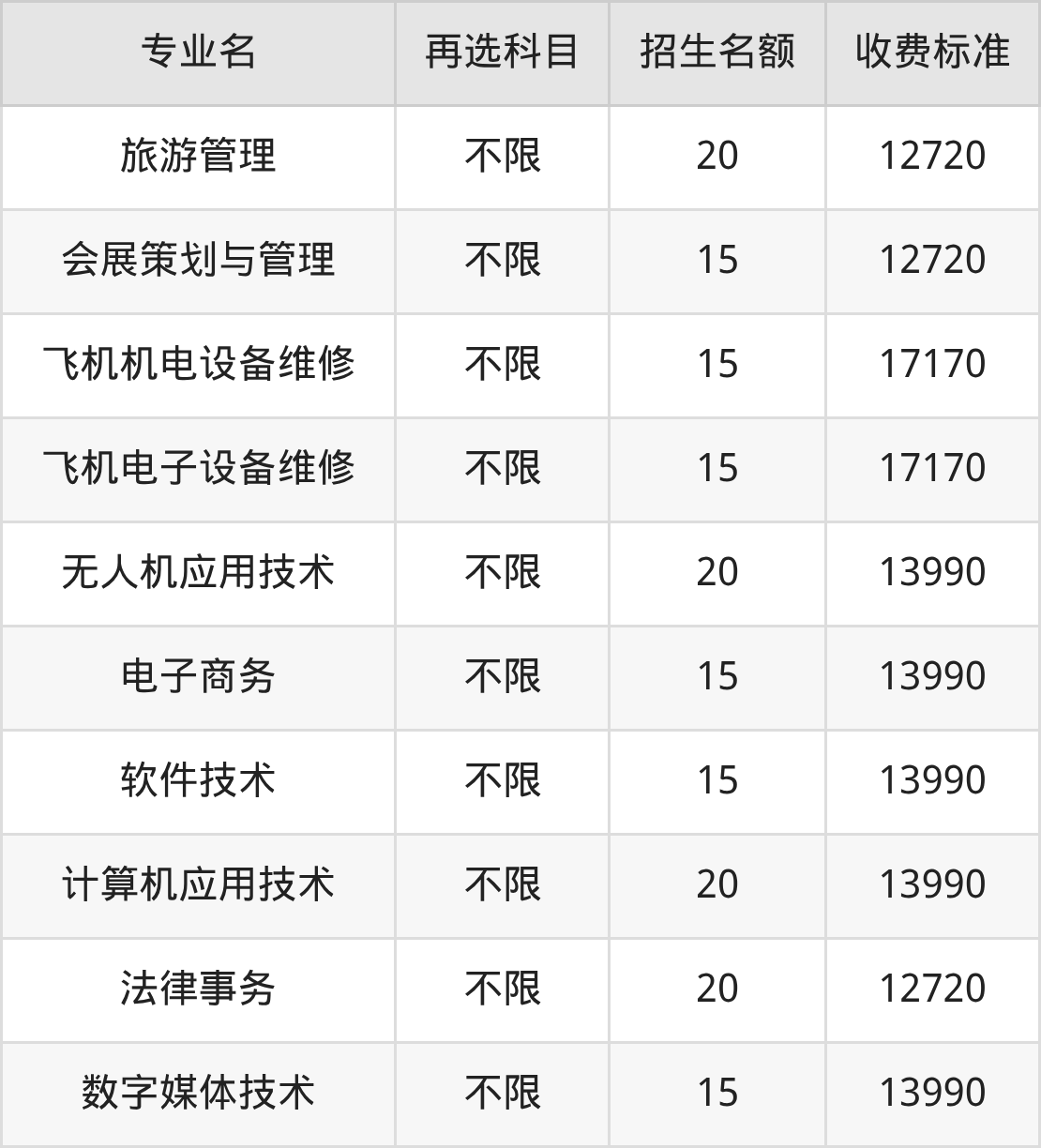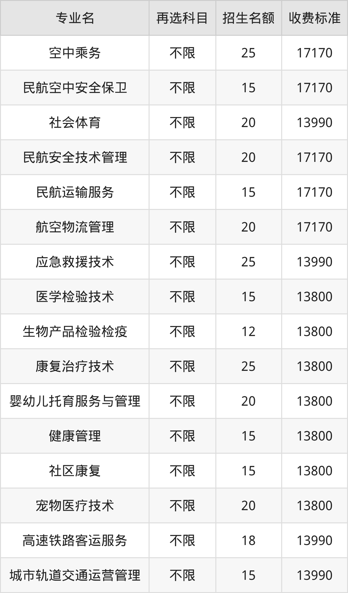 天府新区航空旅游职业学院在历史组高职专科批招生的各个专业,每年的学费是12720元-17170元。招生人数最多的专业是空中乘务,2025年招25人,学费是17170元。