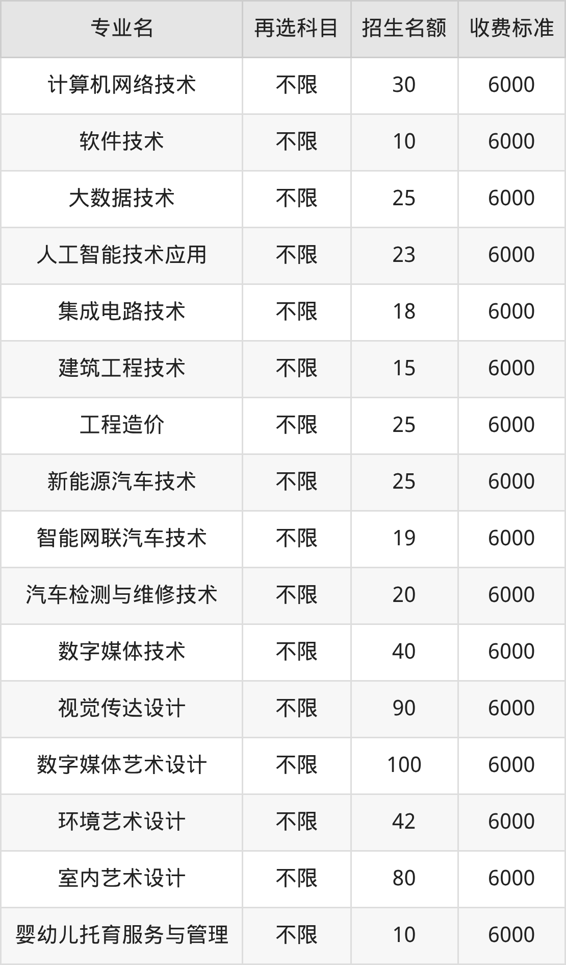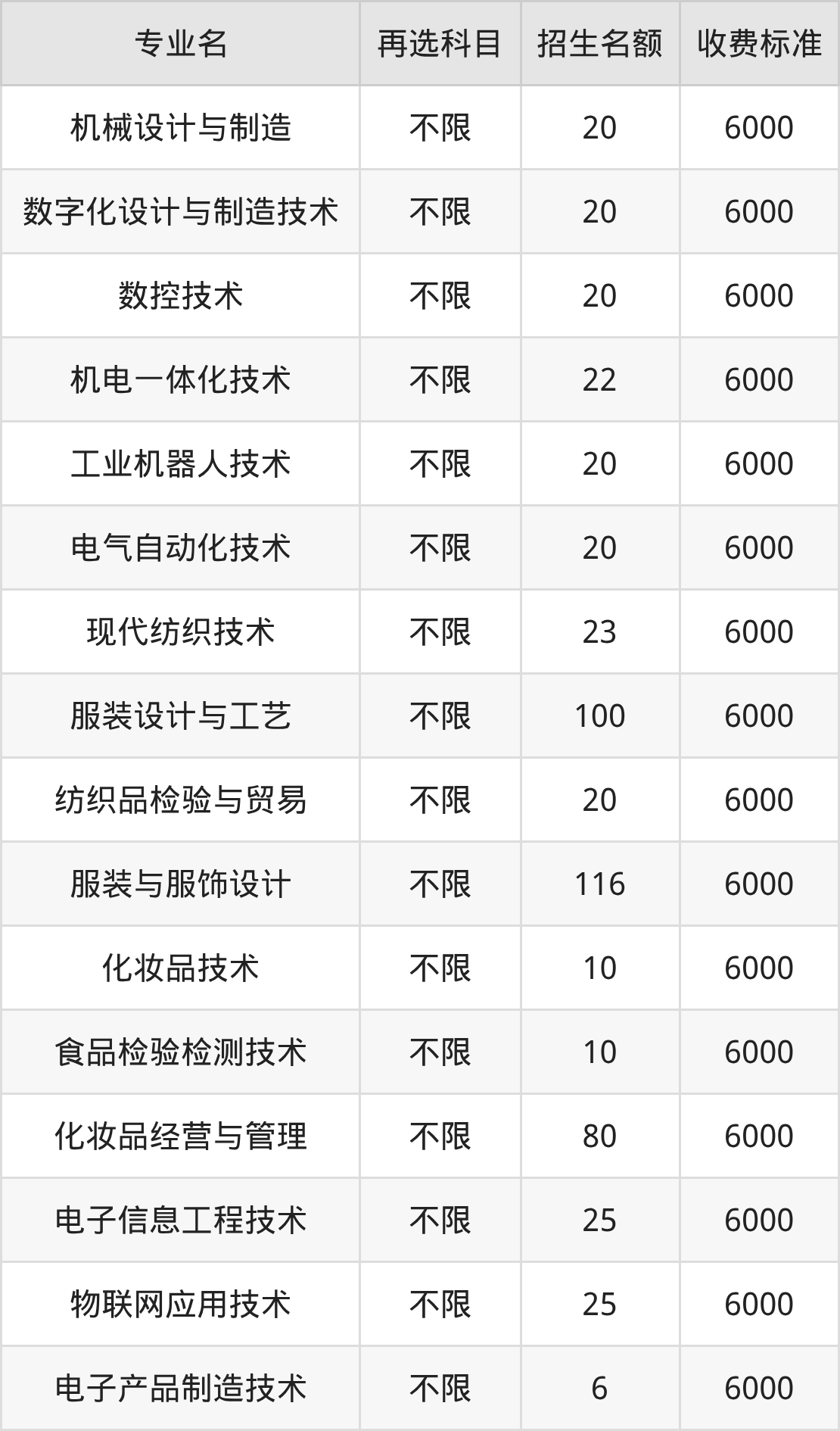 江西工业职业技术学院在历史组高职专科批招生的各个专业,每年的学费是6000元。招生人数最多的专业是服装与服饰设计,2025年招116人,学费是6000元。