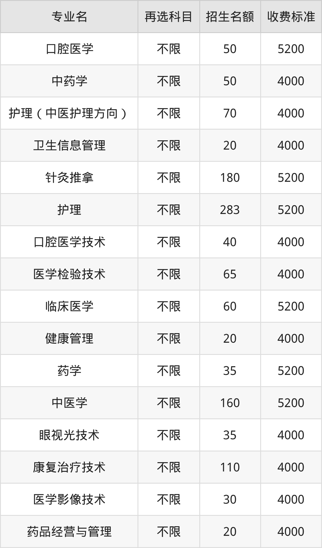 山西卫生健康职业学院在历史组专科高职批招生的各个专业,每年的学费是4000元-5200元。招生人数最多的专业是护理,2025年招283人,学费是5200元。