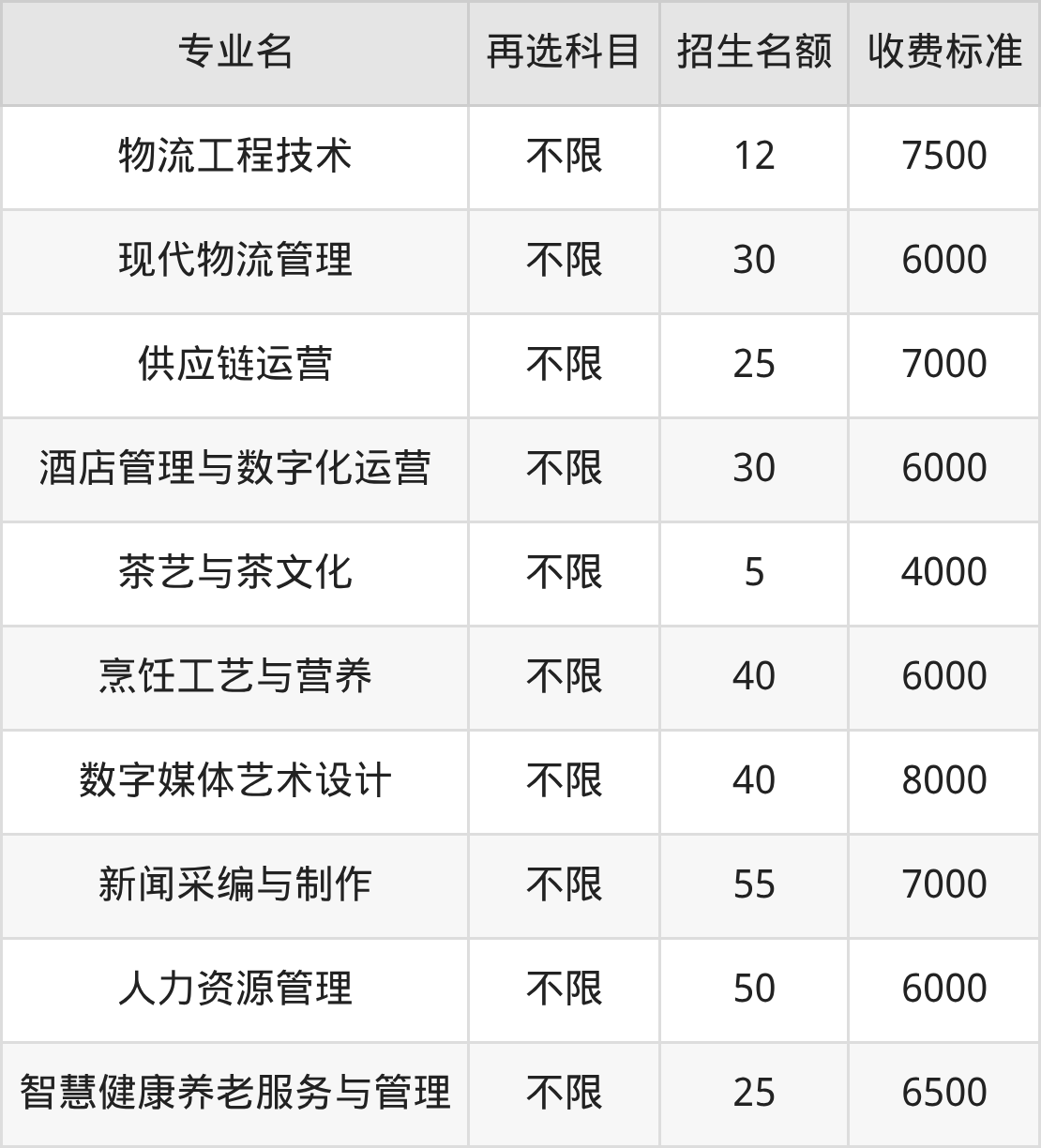 | 高职高专批 | 历史 | 茶艺与茶文化 | 5 |