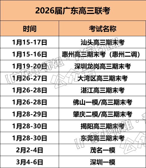 2026届广东高三期末联考自2026年1月中旬起陆续展开,持续至3月初。以下是已公布的具体考试时间安排,考生可根据自己所在地市做好相应的备考规划。