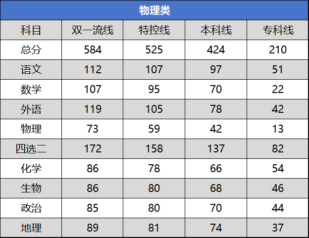 物理:双一流线需达73分,特控线59分,本科线42分,专科线13分。