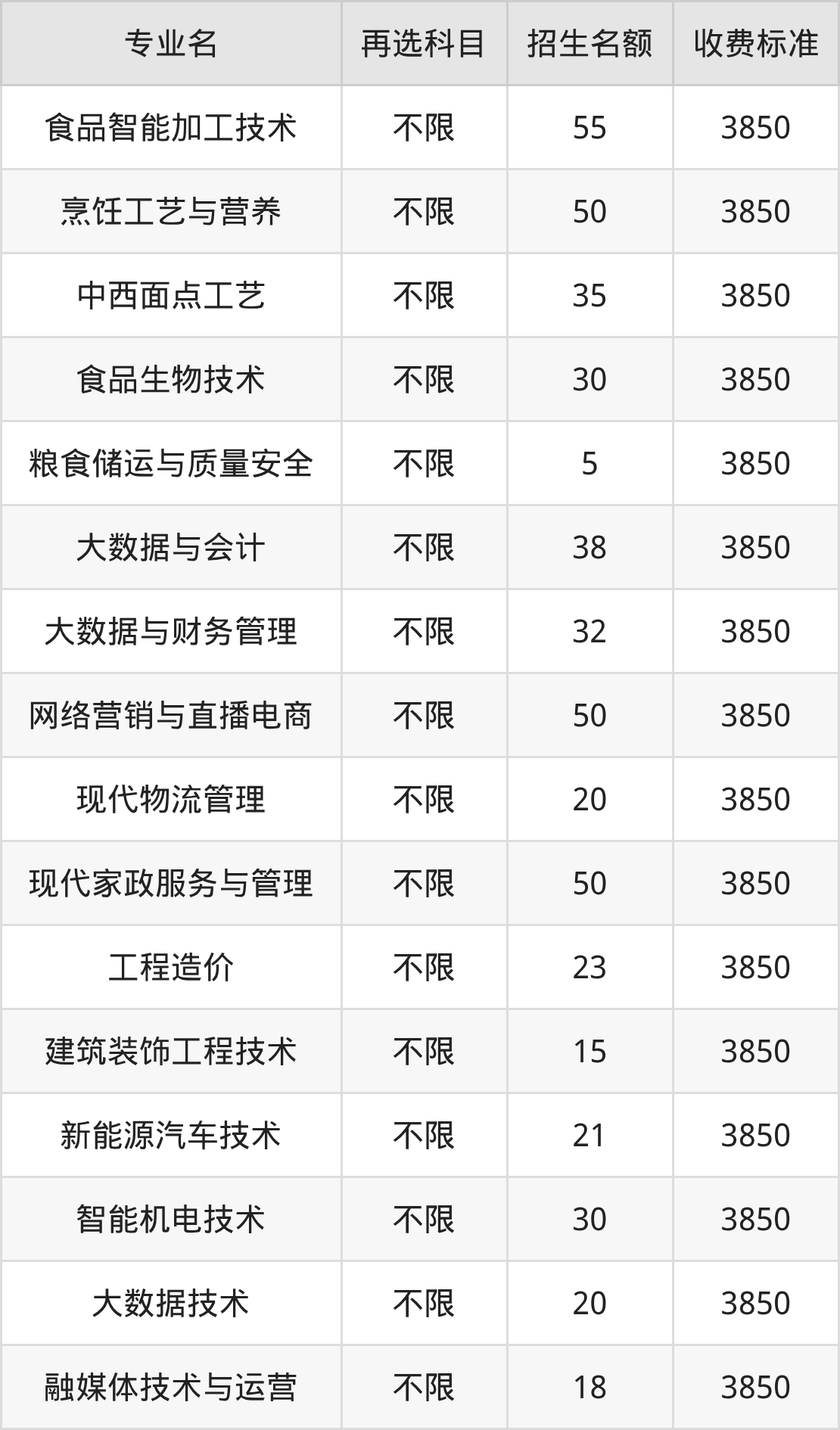 贵州食品工程职业学院在历史组高职专科批招生的各个专业,每年的学费是3850元。招生人数最多的专业是食品智能加工技术,2025年招55人,学费是3850元。